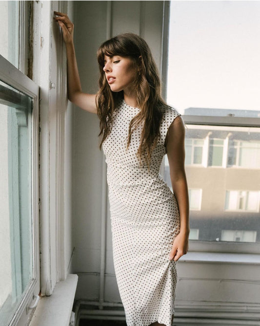 ROBE POLKA DOT MIDI WITH DRAPED WAIST