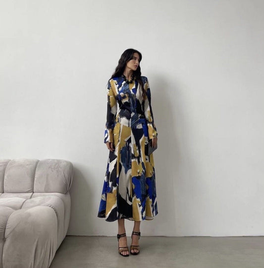 Robe Mi-longue Imprimée Multicolore Bleu/Jaune
