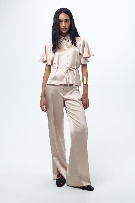 PANTALON SATINÉ BAS FENTES ROSE POUDRÉ