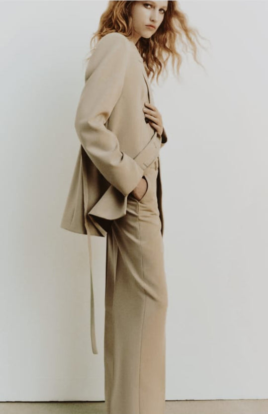 ENSEMBLE BLAZER À BOUTONNAGE CROISÉ AVEC CEINTURE | PANTALON DROIT TABAC