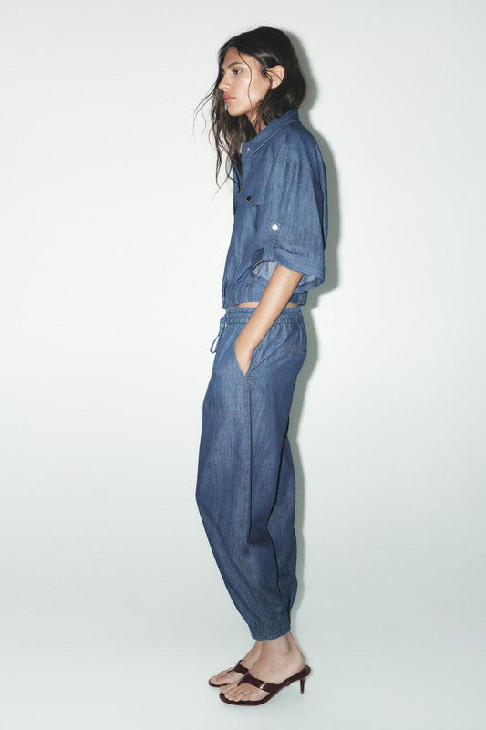 ENSEMBLE VESTE EN LIN À MANCHES COURTES | PANTALON DE JOGGING AVEC LIN