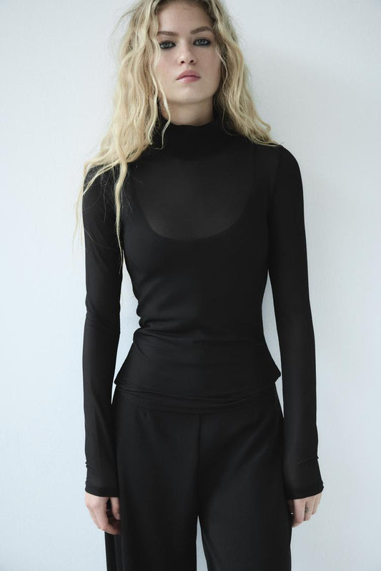 T-SHIRT SEMI-TRANSPARENT À COL CHEMINÉE