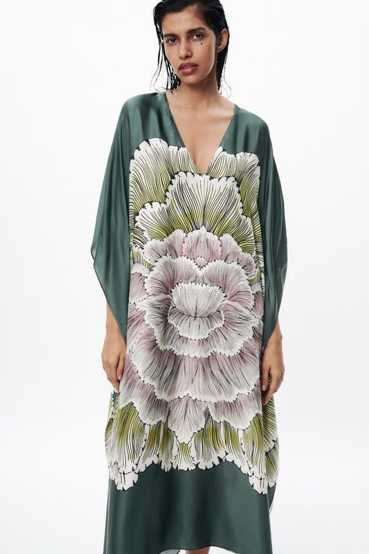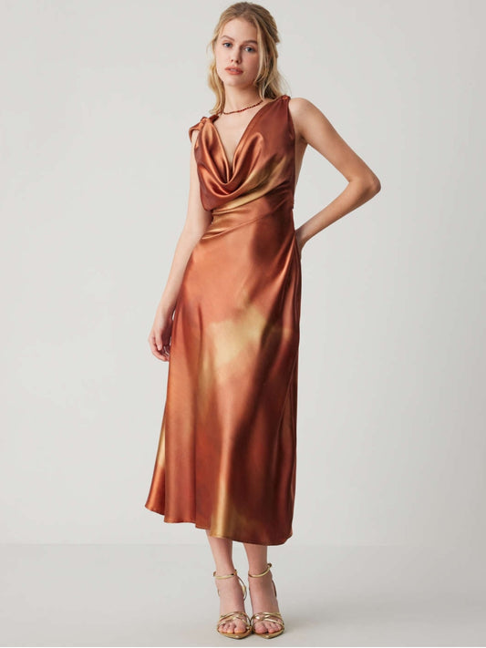 ÉpuiséROBE EN SATIN IMPRIMÉE OCRE