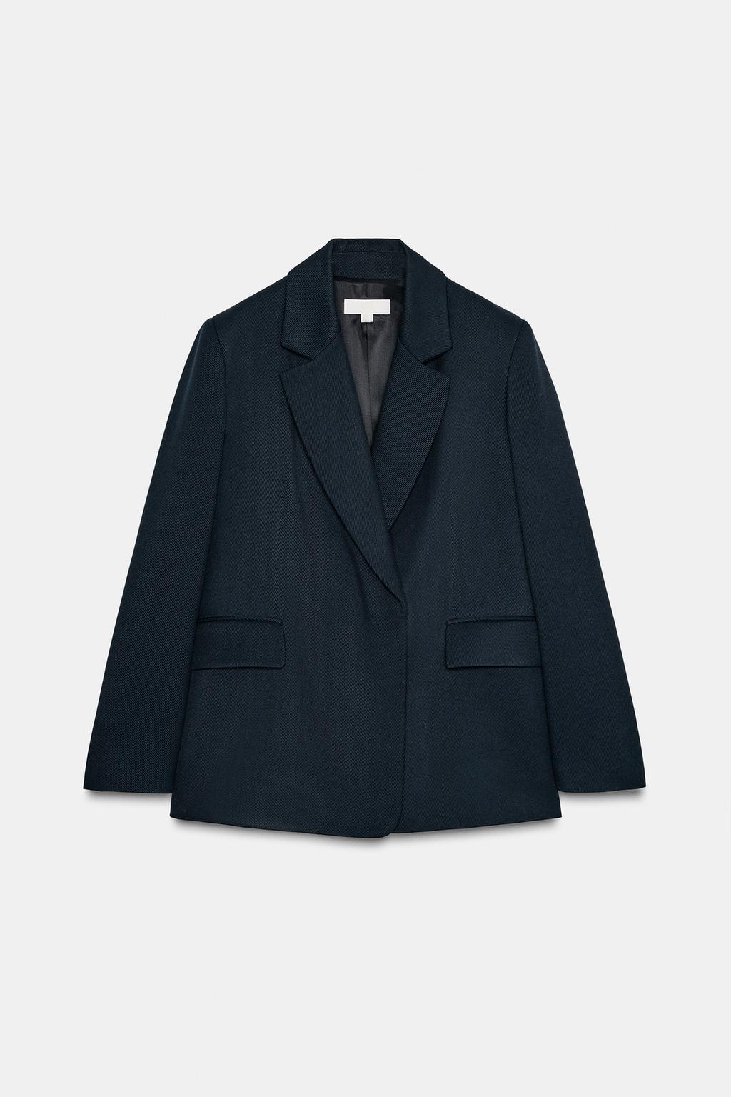 Blazer ample avec col à revers et manches longues avec épaulettes. Poches avant à rabat. Bas avec ouverture au dos. Fermeture avant croisée avec boutons cachés.