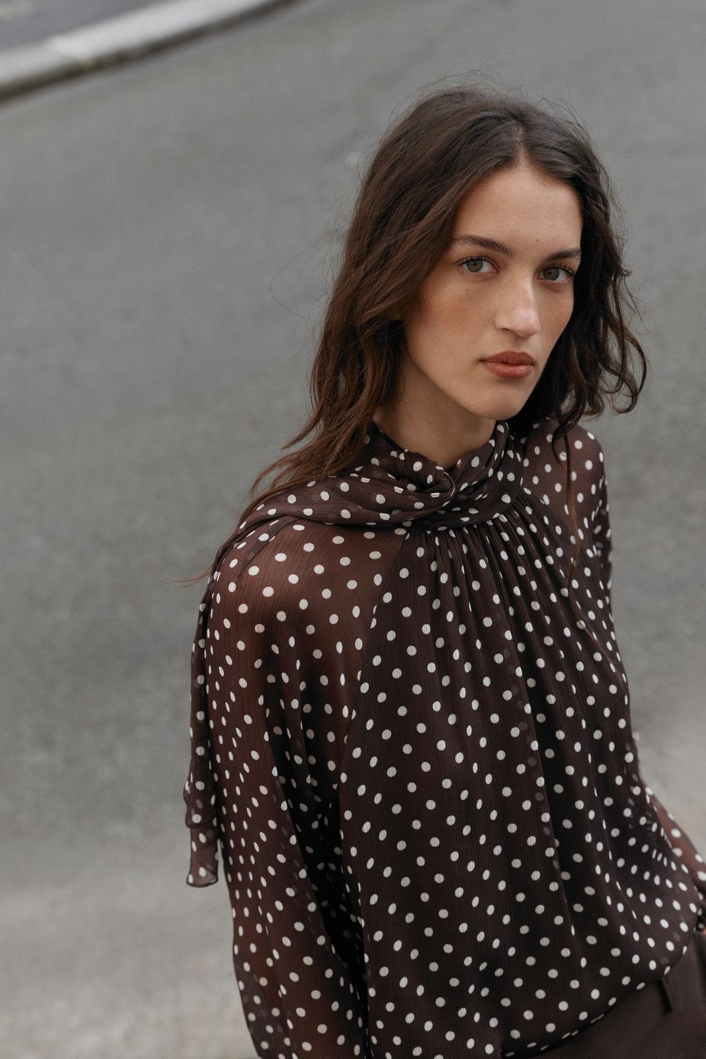 Blouse à col montant avec nœud au dos et manches longues avec poignets élastiques. Doublure intérieure et imprimé à pois.
