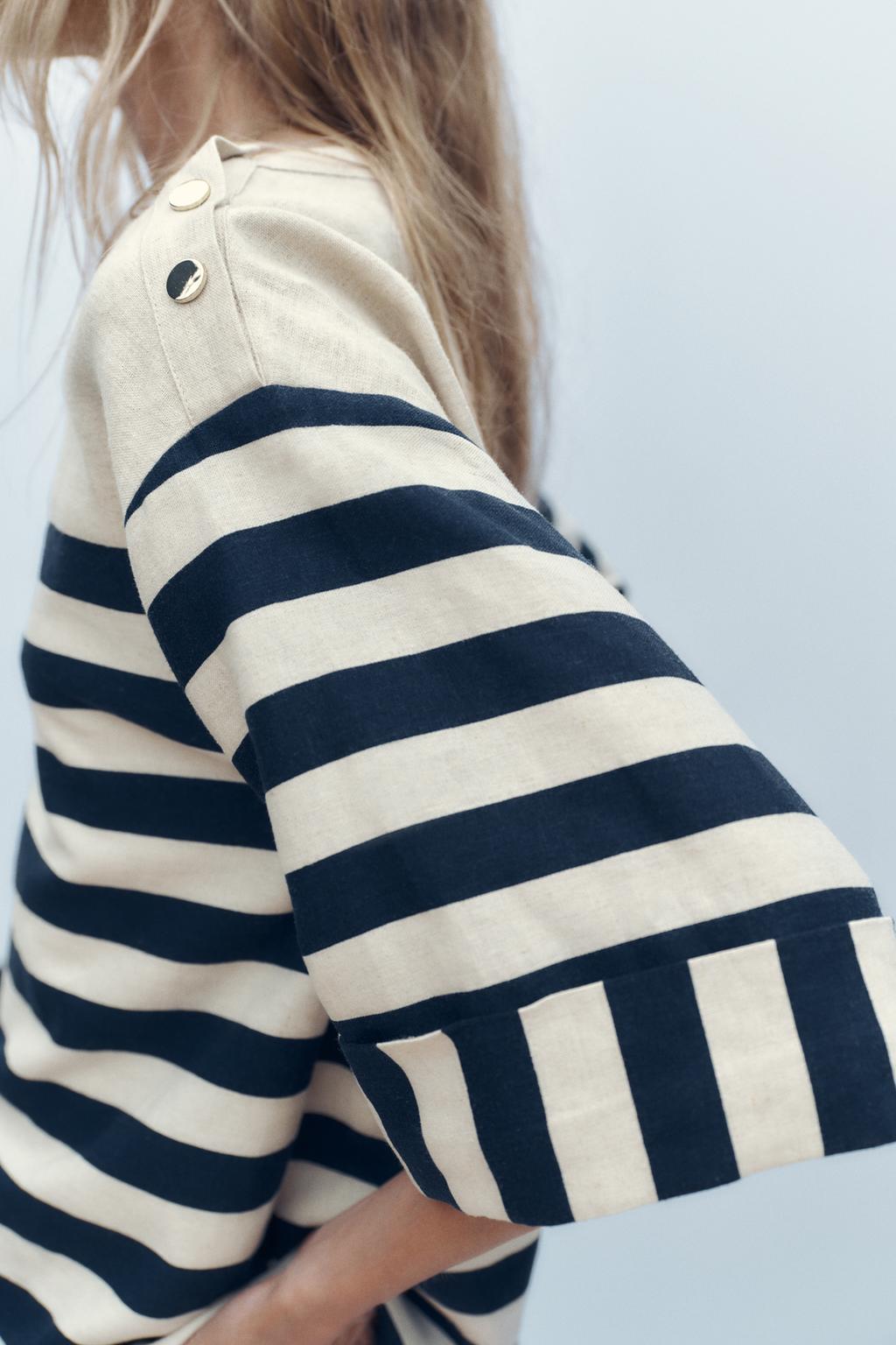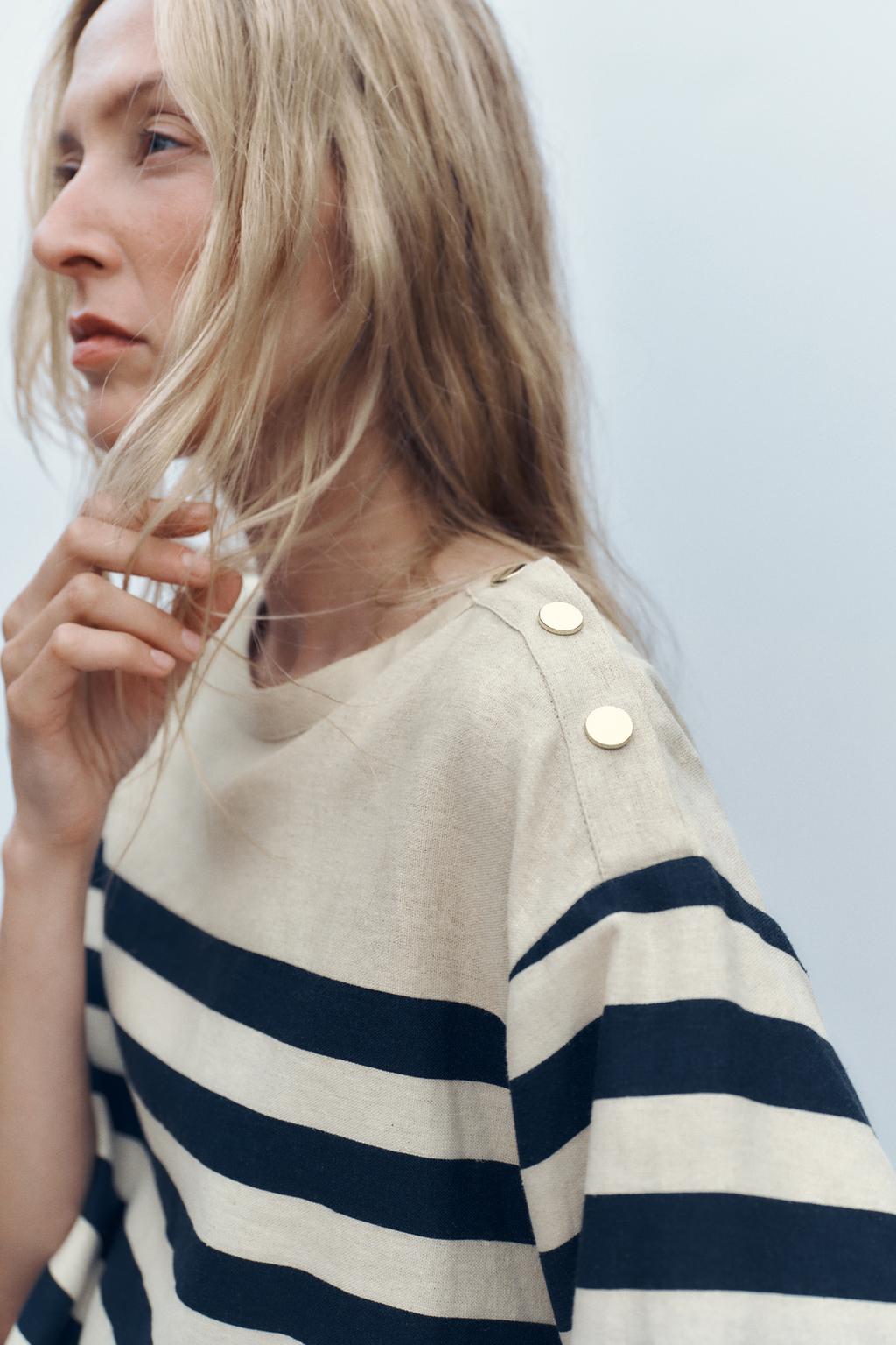 Chemise confectionnée avec du lin. Encolure bateau et manches courtes larges avec revers et boutons sur l'épaule.