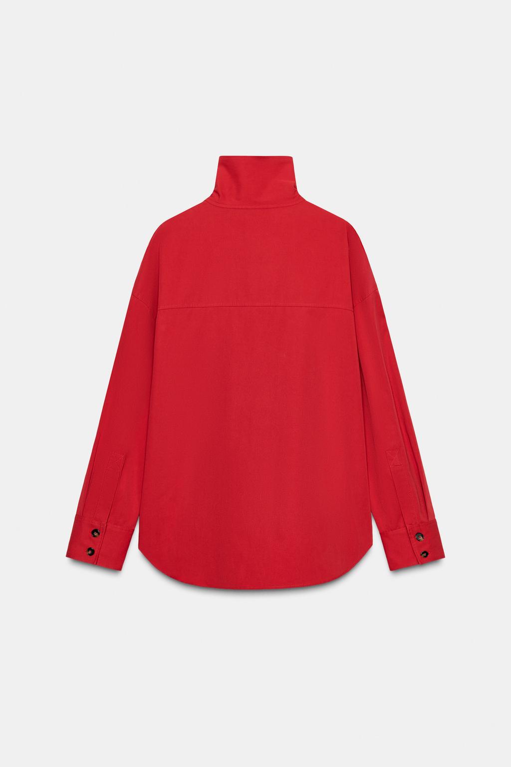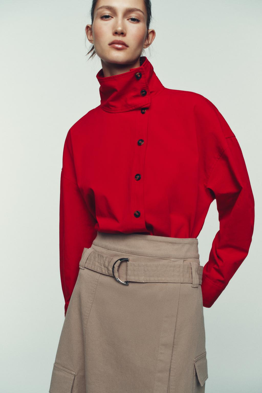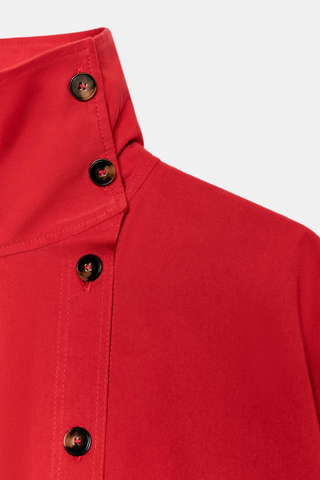Chemise avec col montant et manches longues. Ourlet asymétrique. Fermeture cache-cœur boutonnée sur le devant.