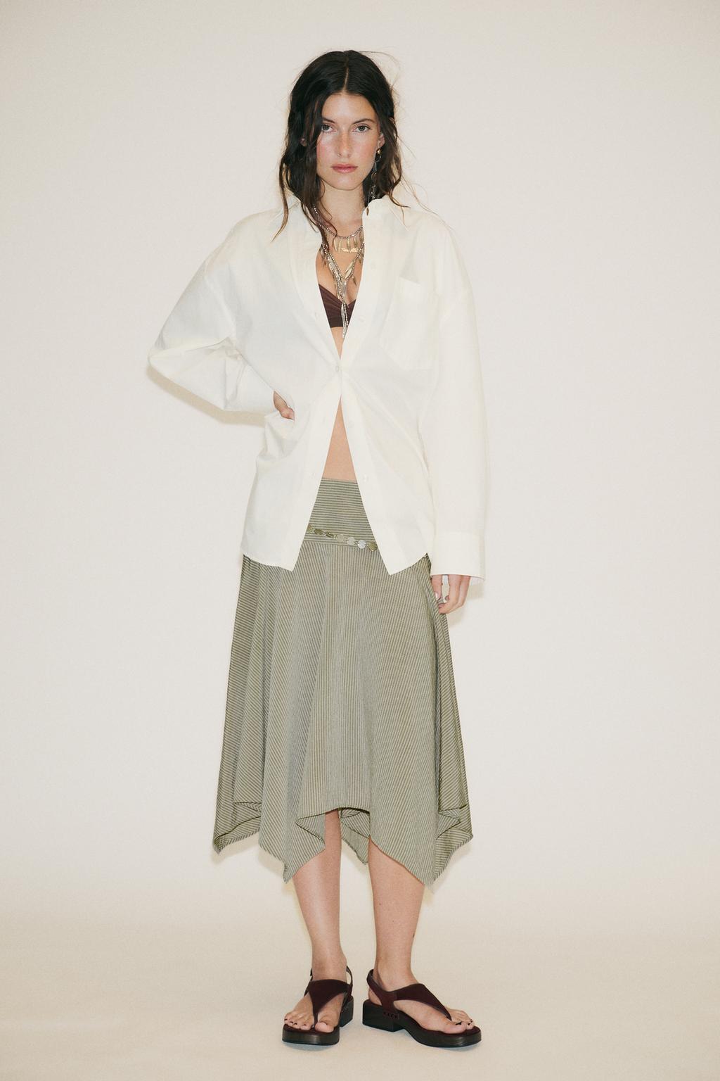 Chemise oversize avec col à revers et manches longues terminées par des poignets avec plis. Poche plaquée sur la poitrine. Détail de pattes dans le dos. Fermeture boutonnée sur le devant.