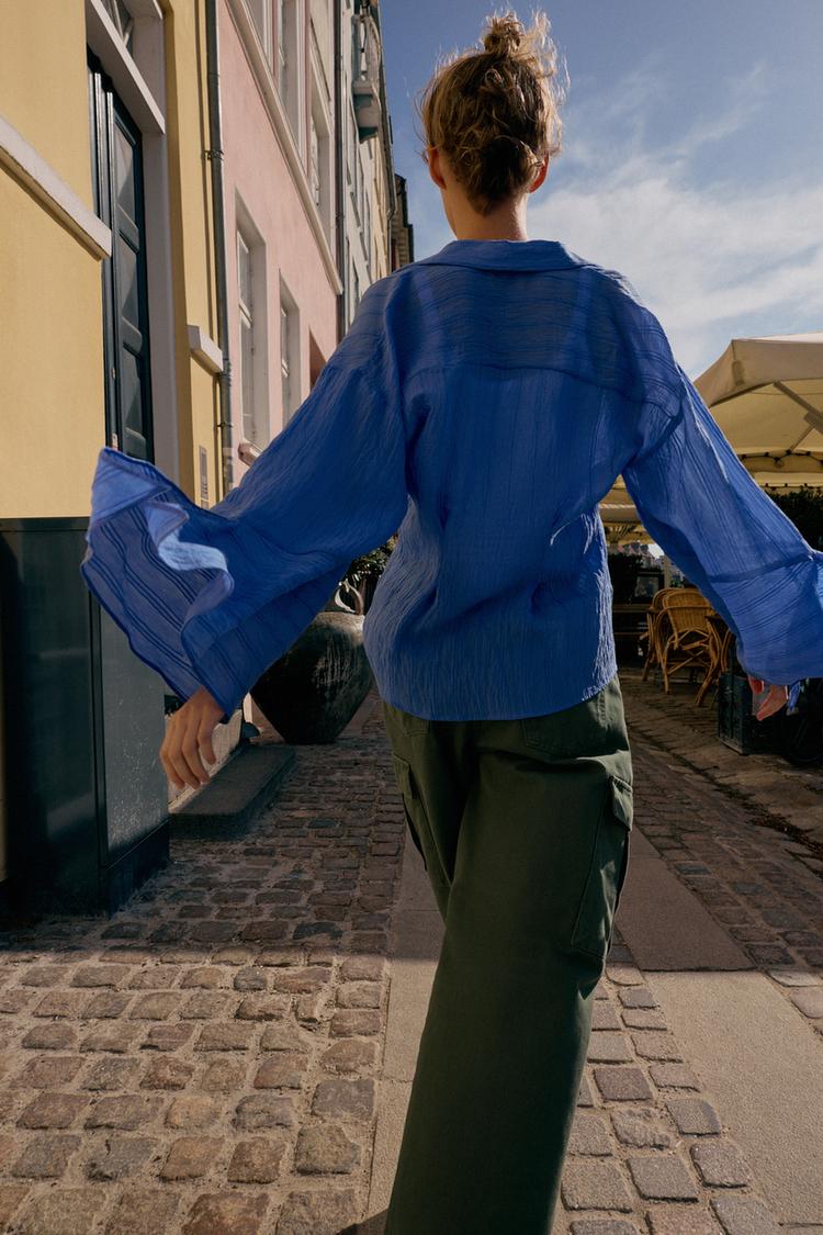 Chemise avec col à revers et manches terminées par des lacets. Détail de rayures ton sur ton. Fermeture frontale par boutons dissimulés.