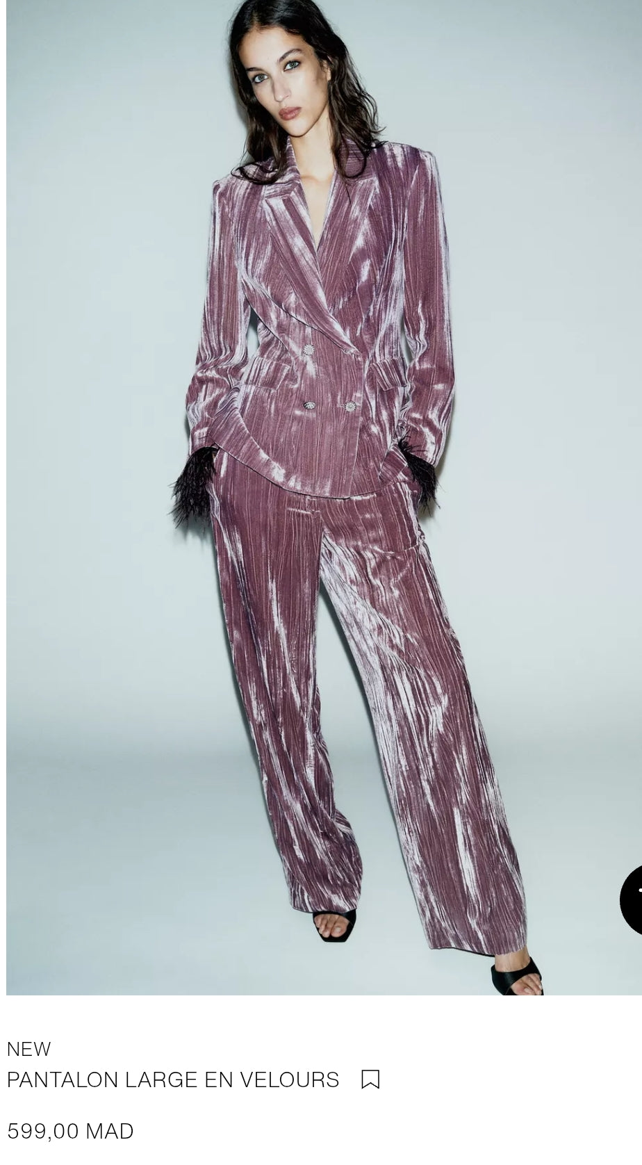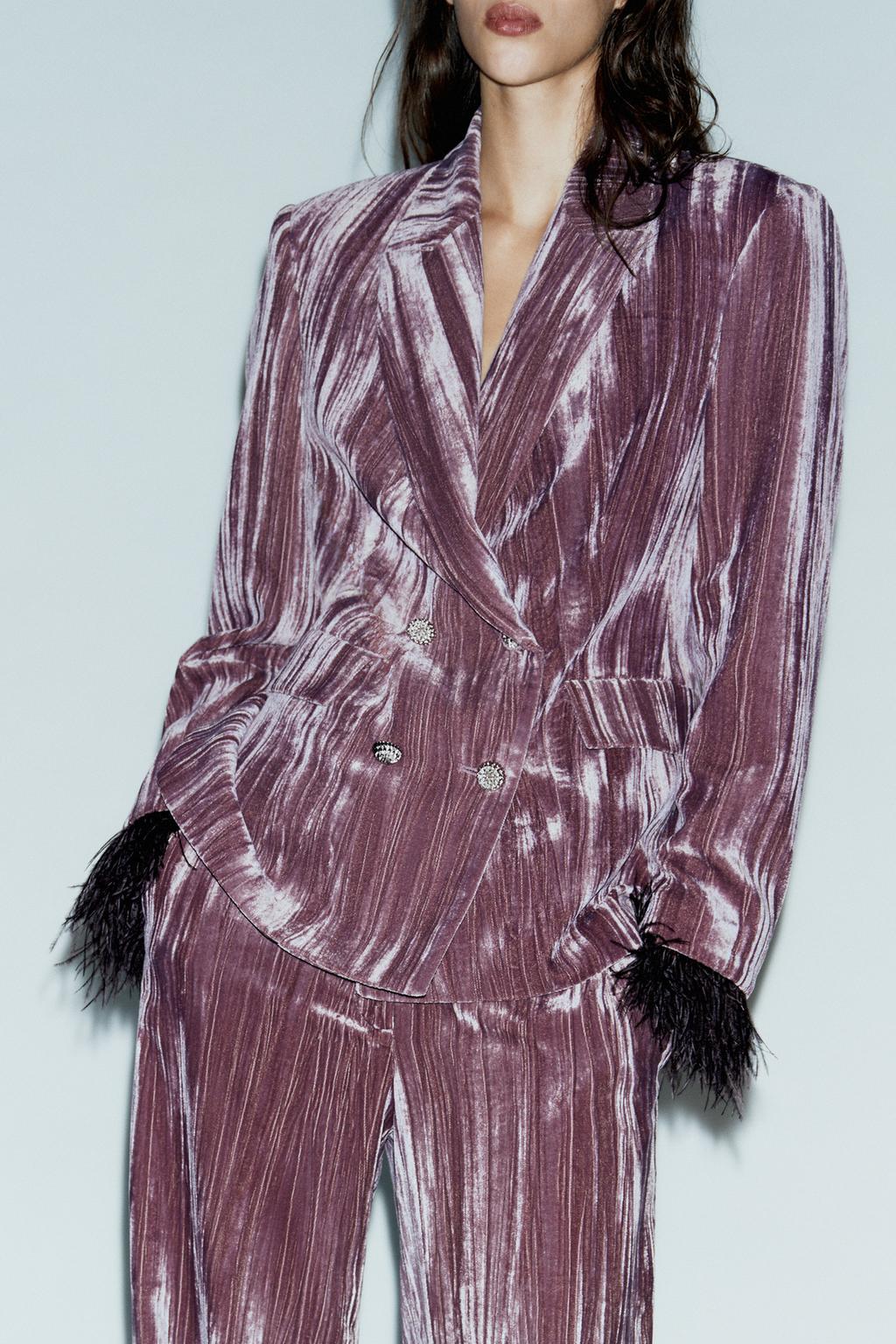 ENSEMBLE VESTE À BOUTONNAGE CROISÉ EN VELOUR ET PLUMES | PANTALON LARGE EN VELOURS