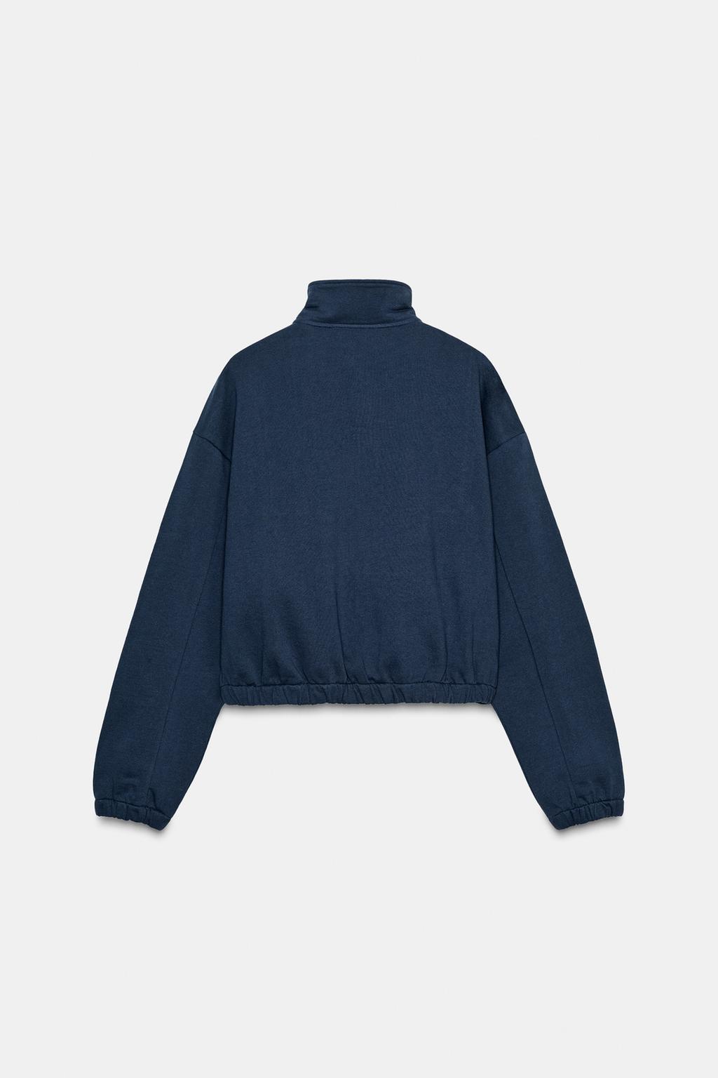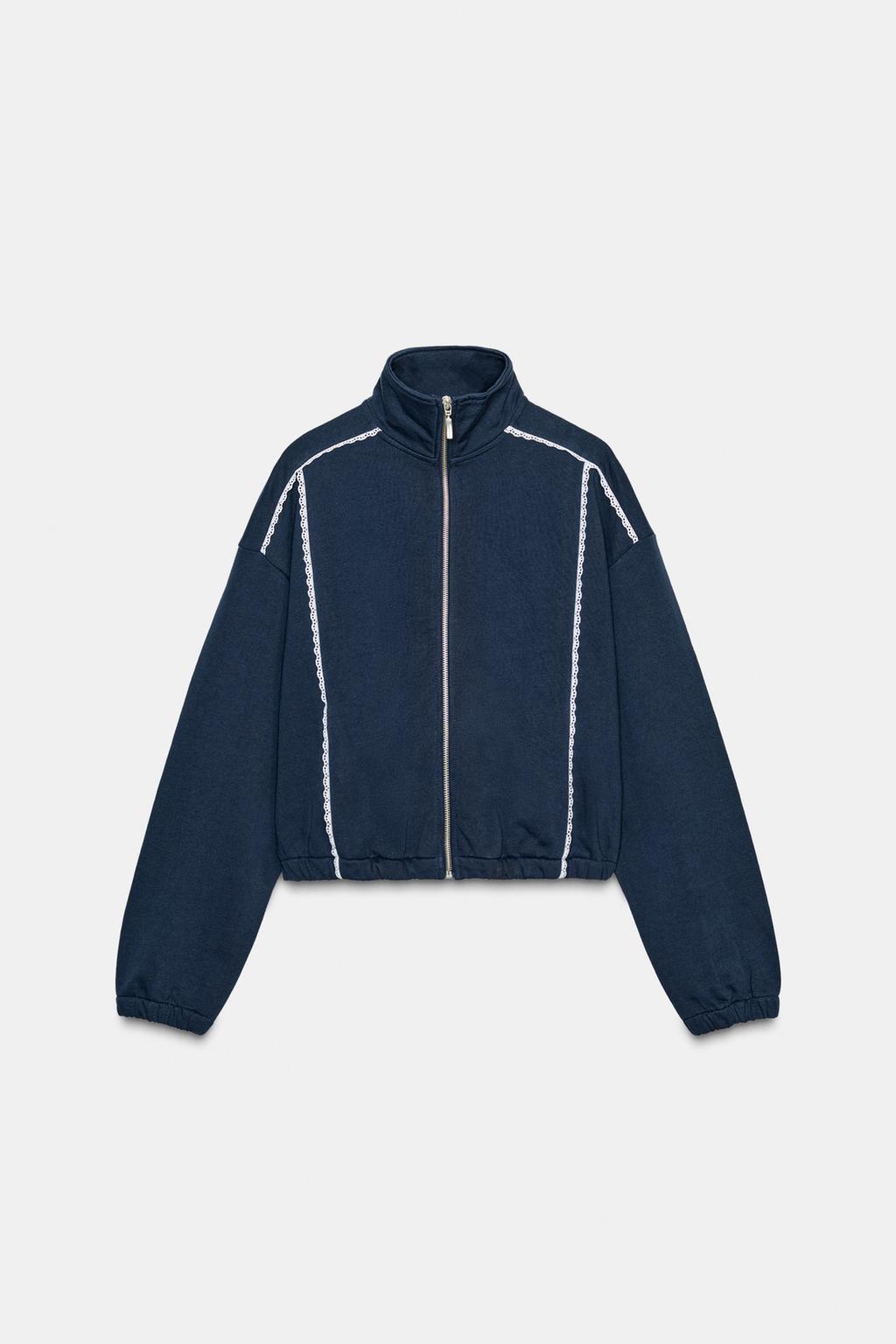 Sweat à col montant et manches longues terminées par des poignets élastiques. Détail de dentelle combinée en contraste. Fermeture zippée sur le devant.