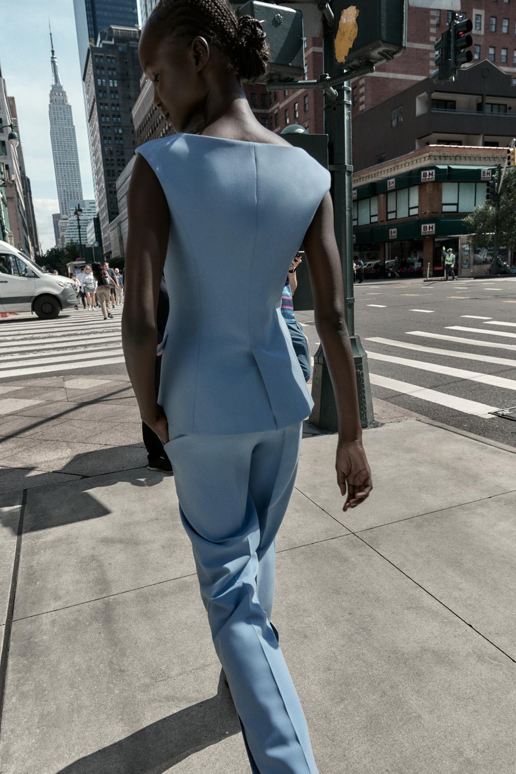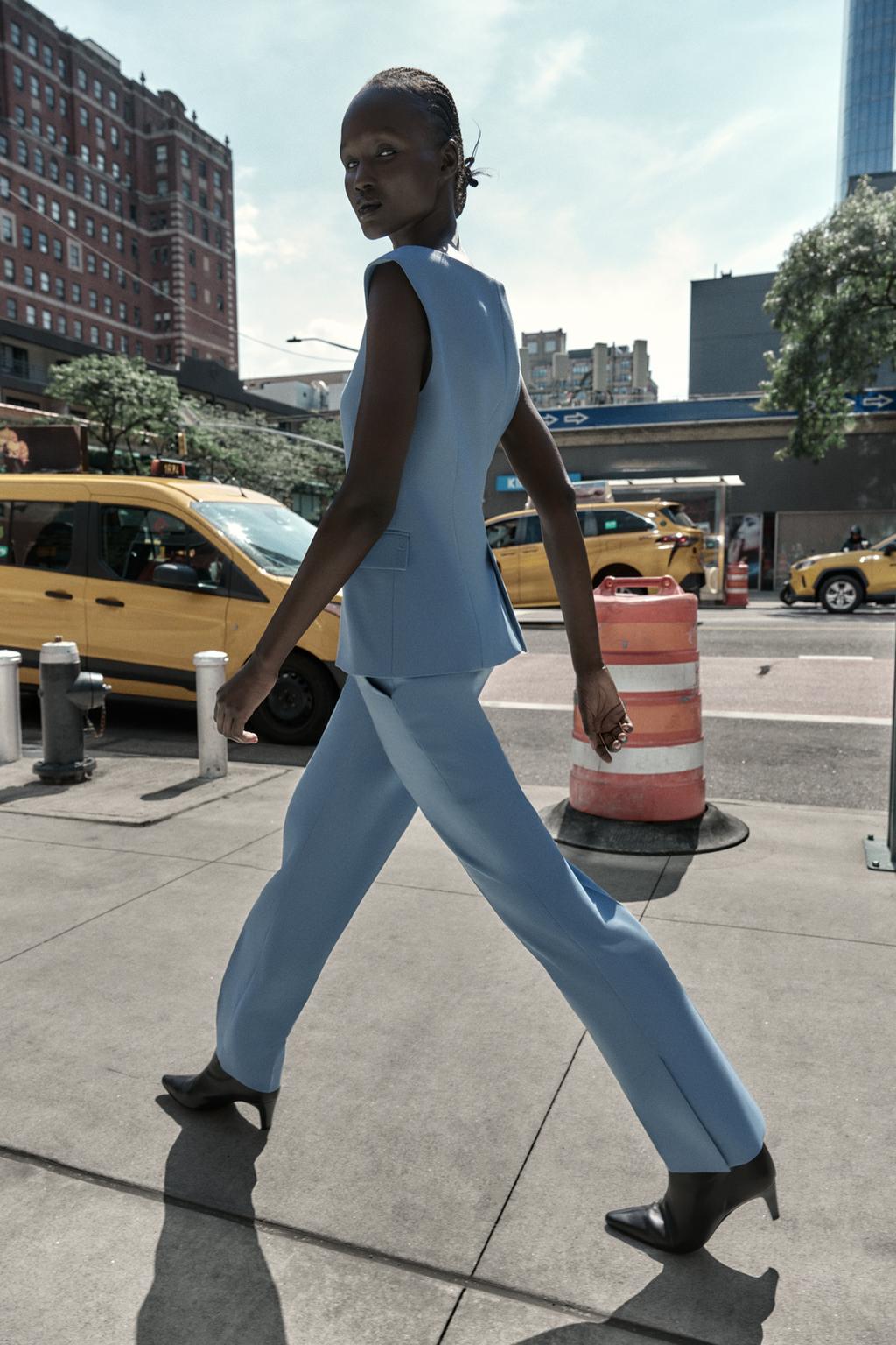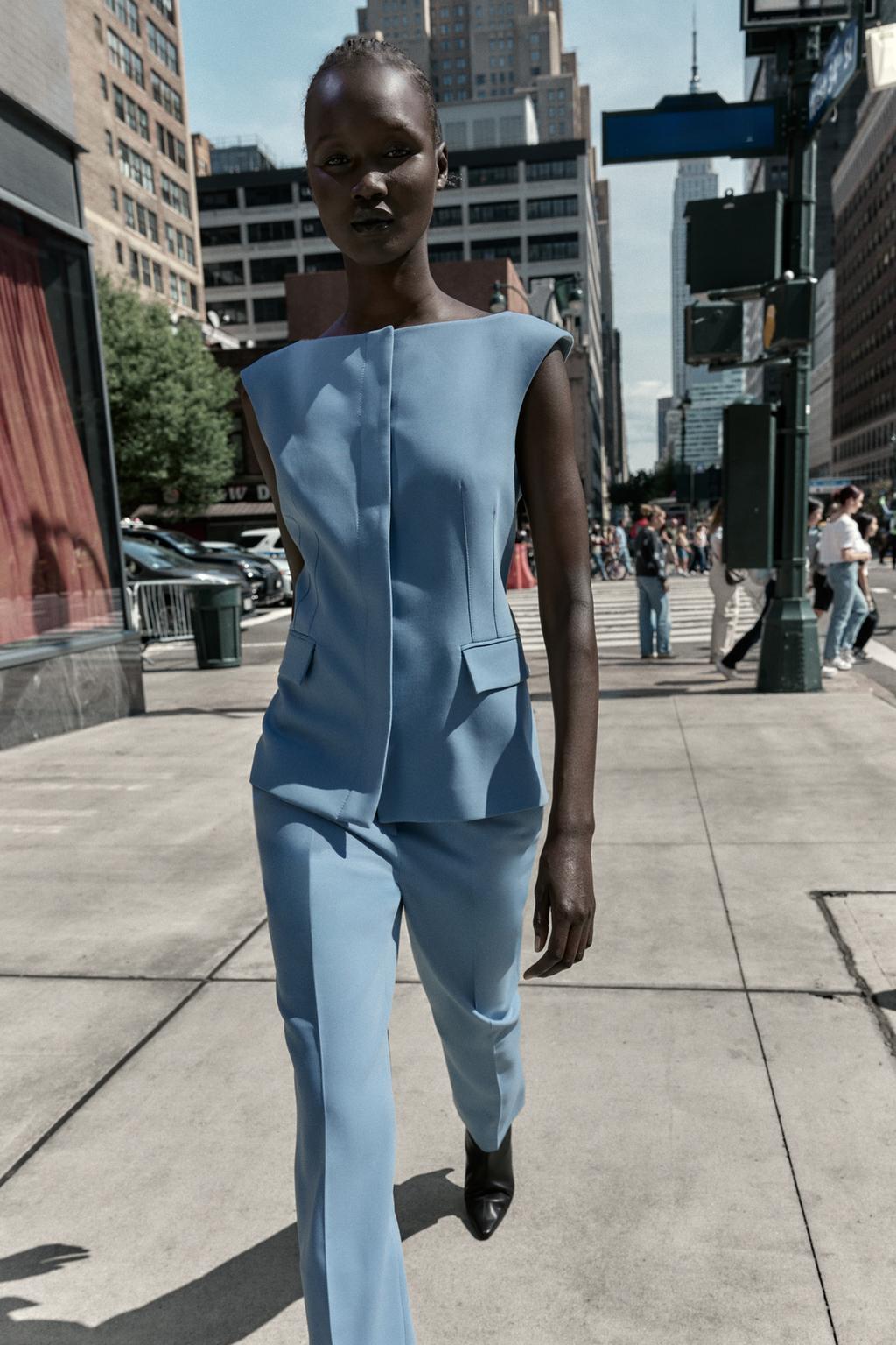 Gilet à encolure bateau et sans manches. Poches avant avec rabat. Bas avec ouverture au dos. Fermeture avant avec boutons-pression invisibles.
