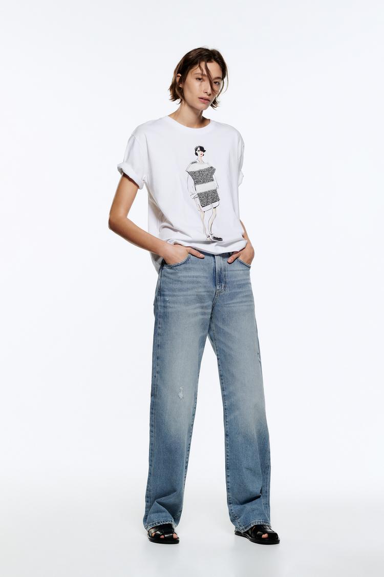 T-shirt with a round neckline and short sleeves. Contrast girl print detail on the front with contrast fabric appliqué.