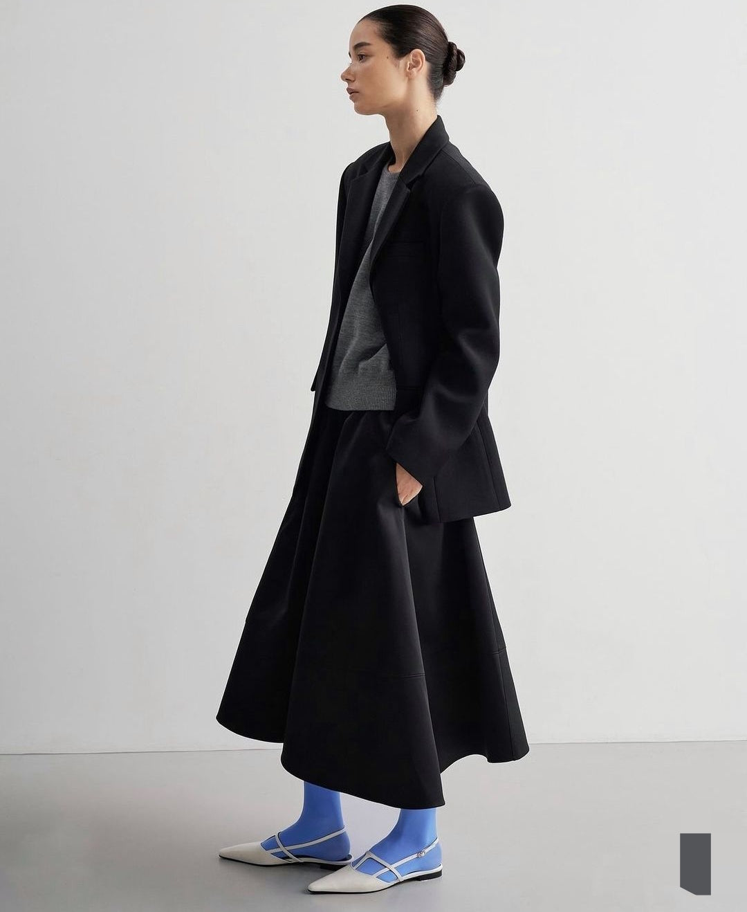 Jupe mi-longue taille normale confectionnée en filature avec du coton. Poches latérales dissimulées dans la couture. Bas fini en coupe évasée. Fermeture avec zip dissimulé dans la couture.