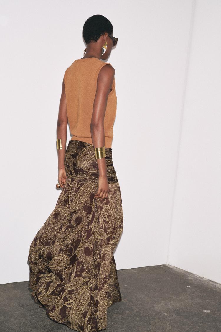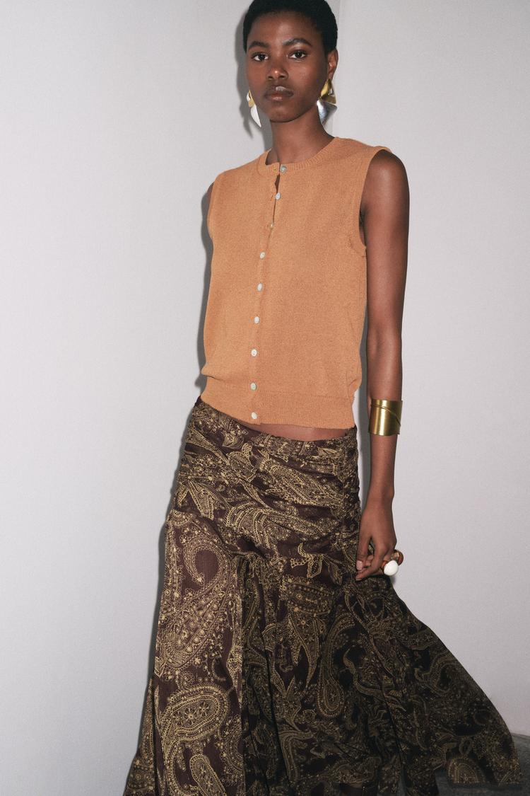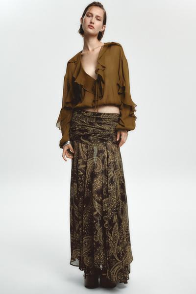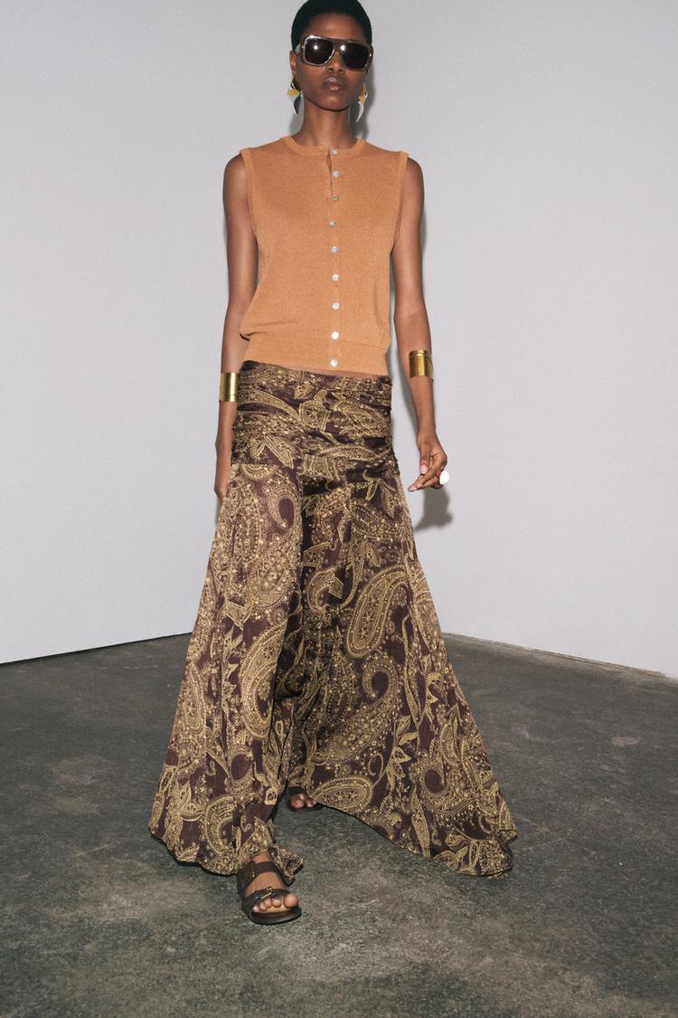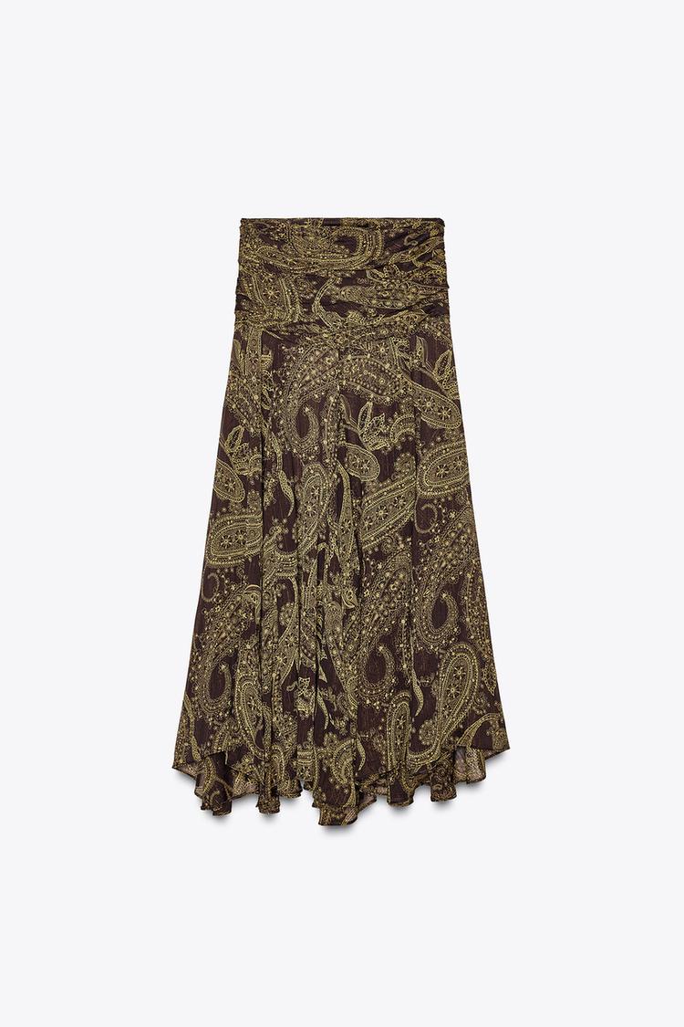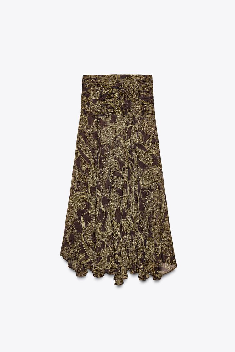 Jupe midi taille haute et taille avec drapé latéral. Bas asymétrique fini en coupe évasée. Fermeture avec zip dissimulé dans la couture.
