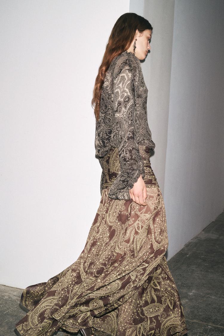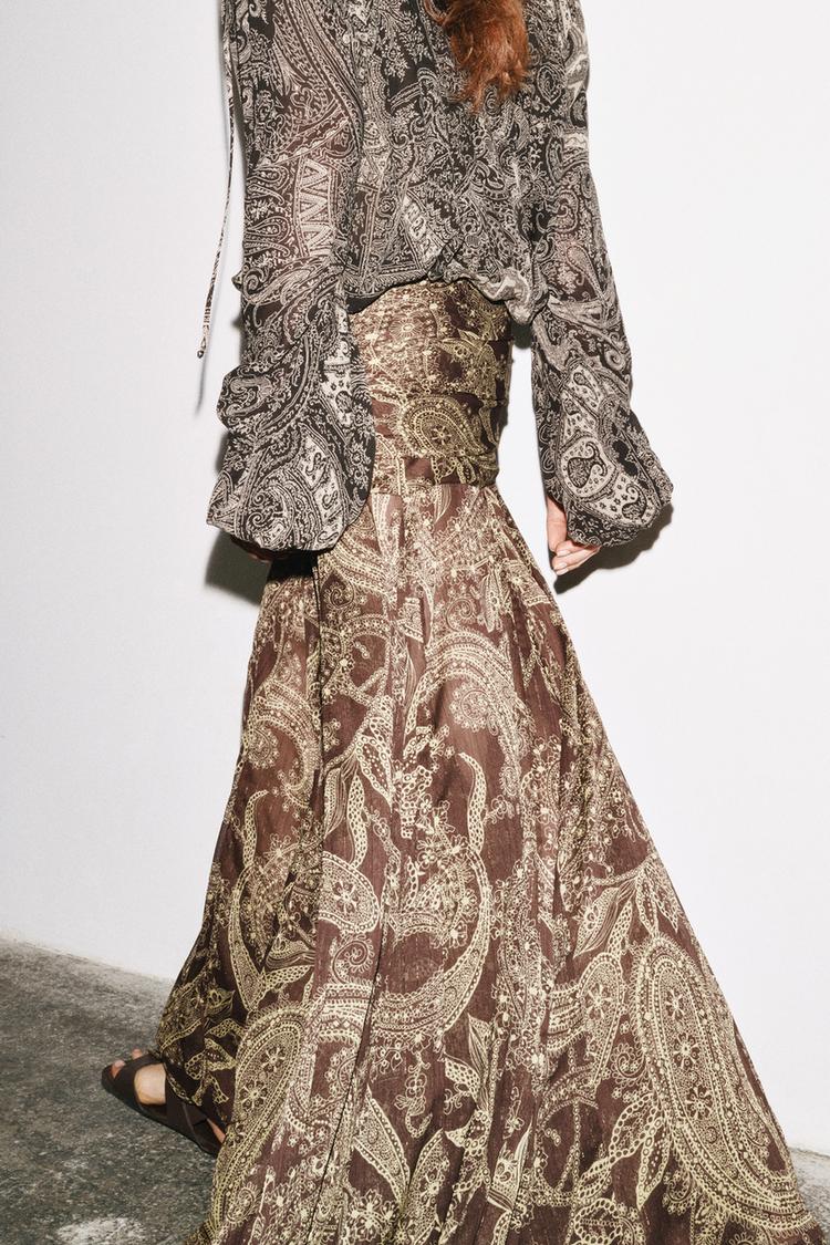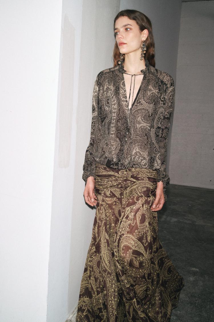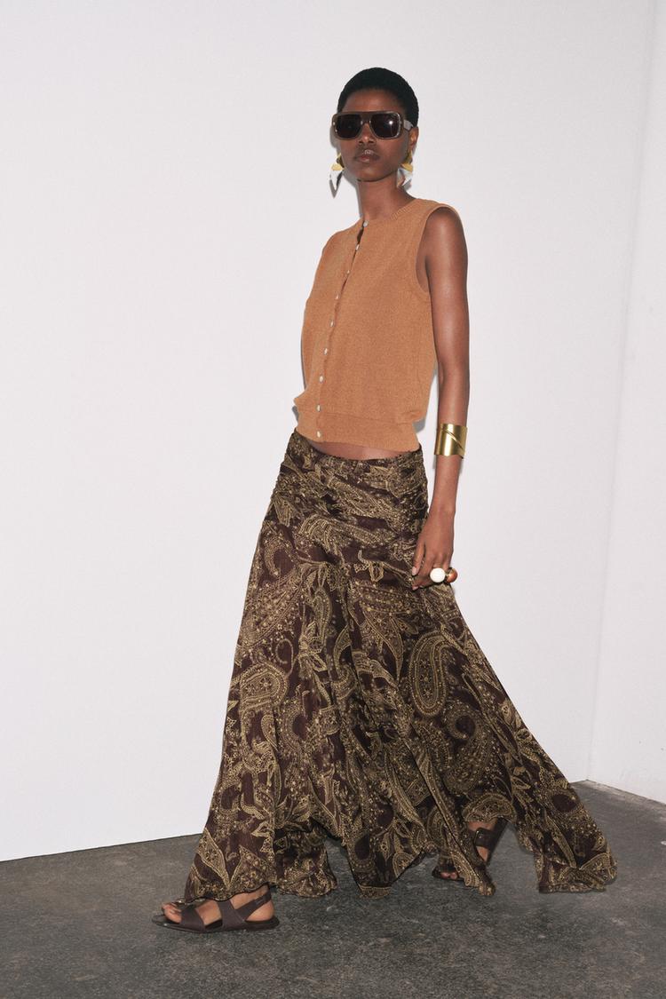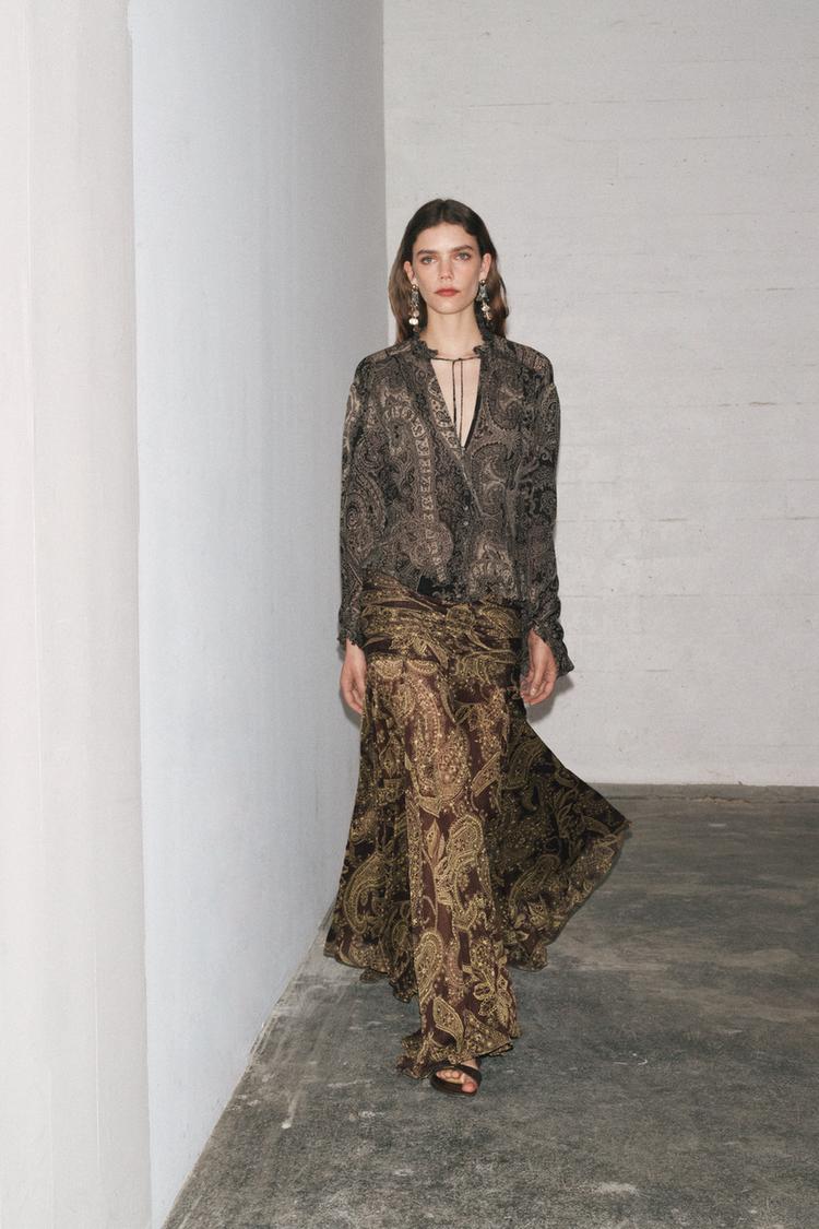 Jupe midi taille haute et taille avec drapé latéral. Bas asymétrique fini en coupe évasée. Fermeture avec zip dissimulé dans la couture.