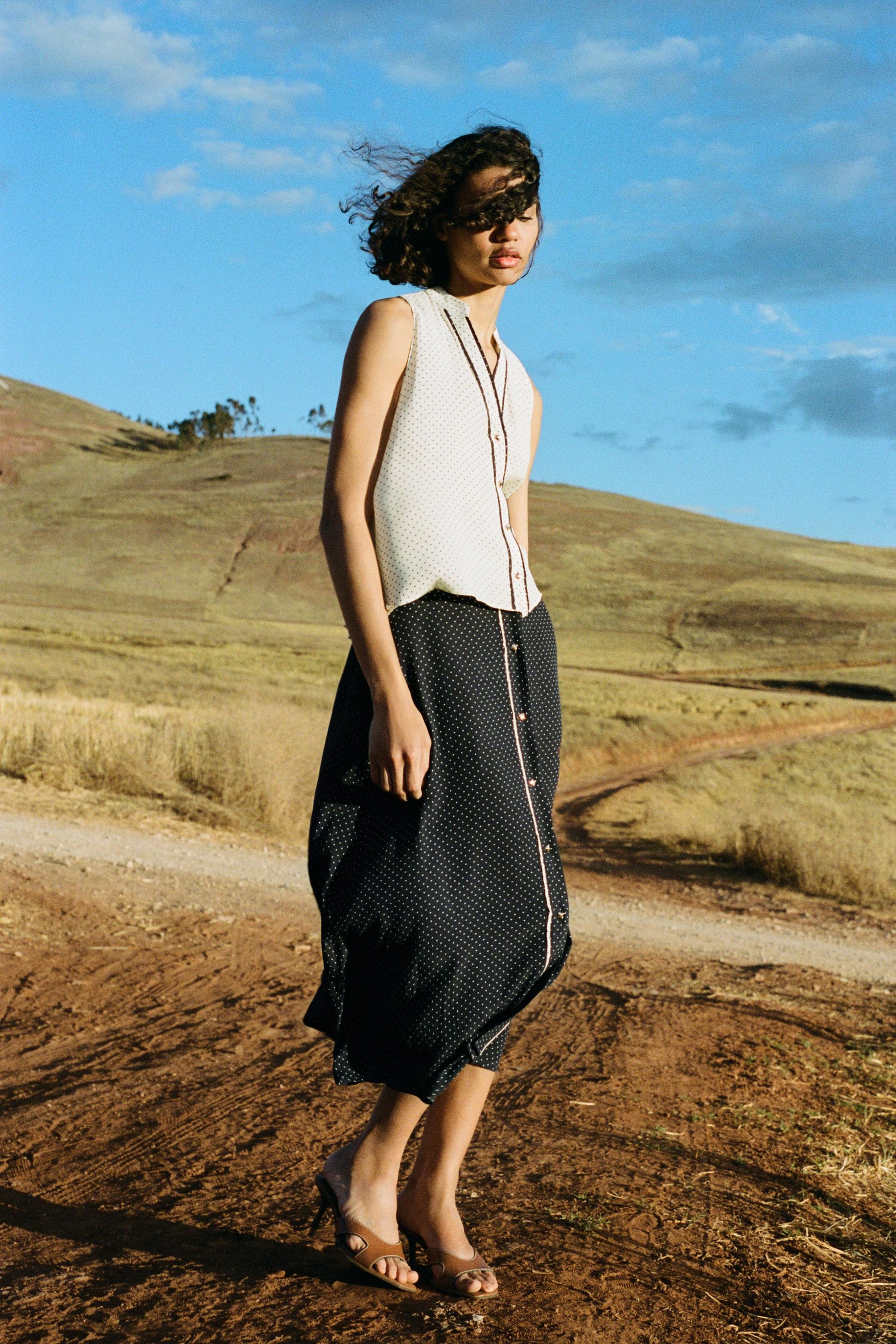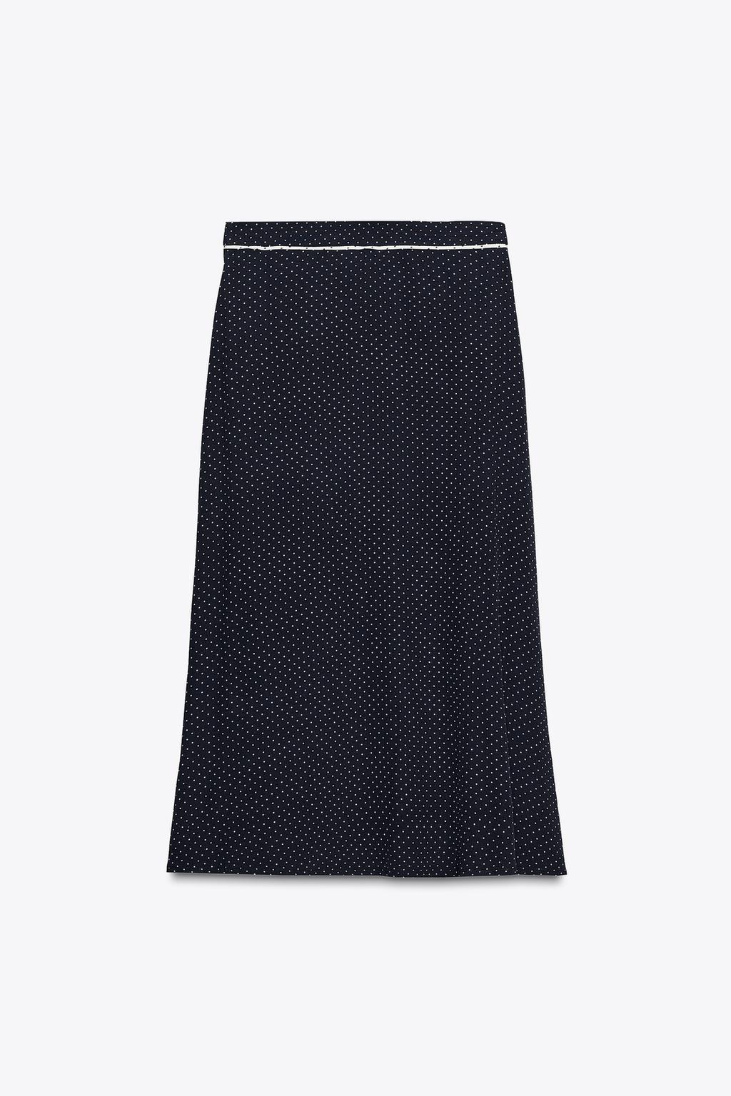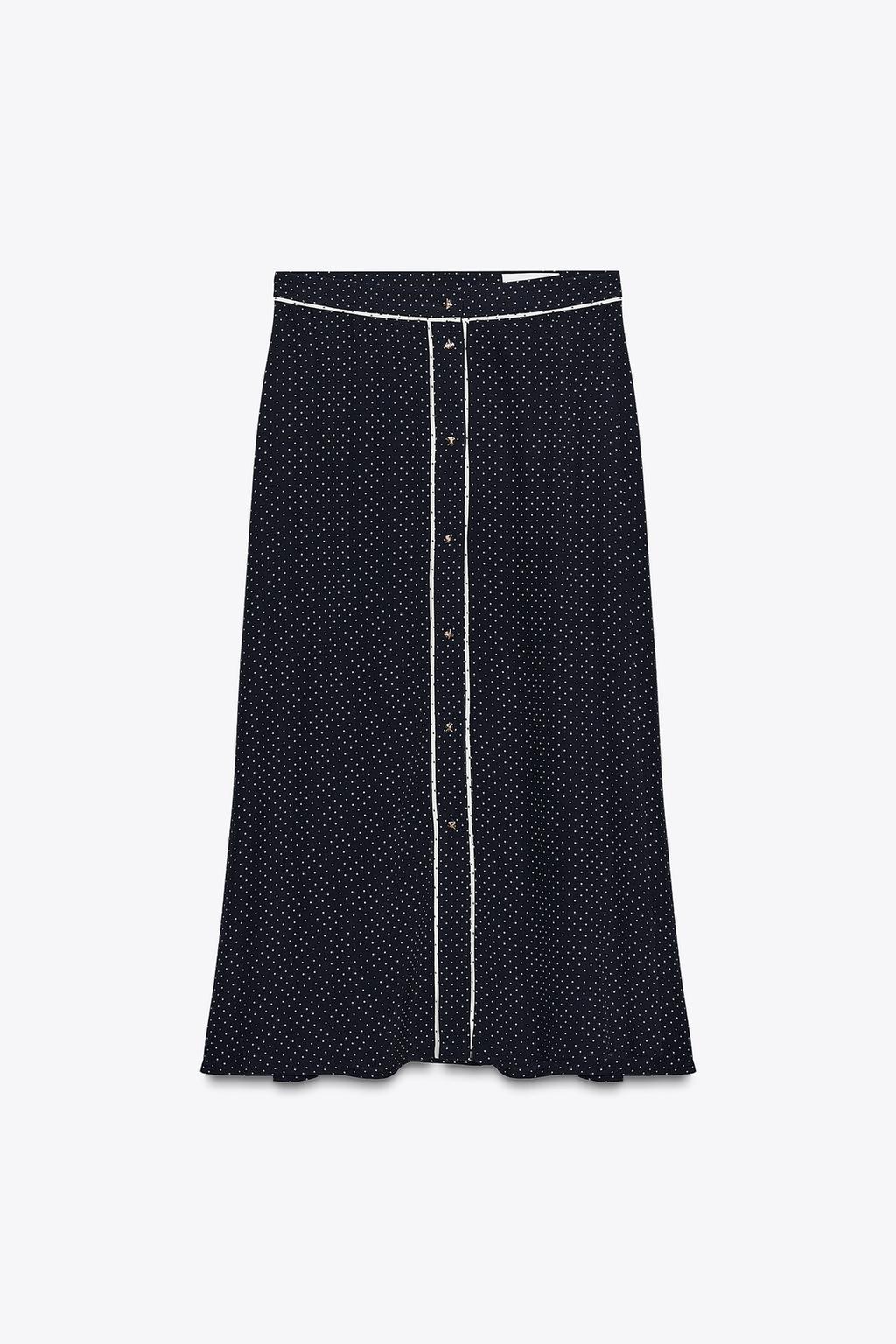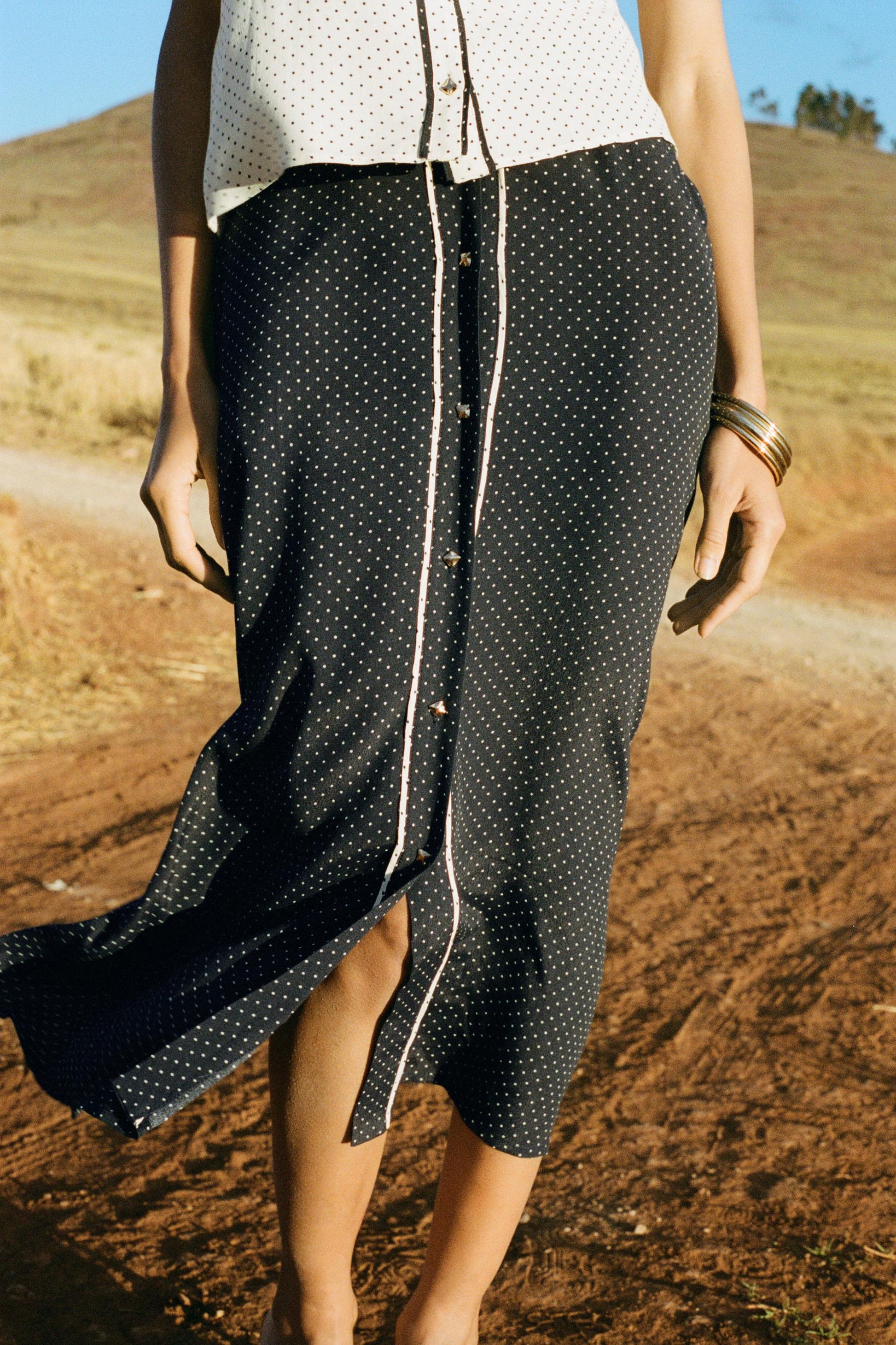 Jupe taille haute. Poches latérales dissimulées dans les coutures. Passepoil contrasté. Fermeture boutonnée sur le devant.