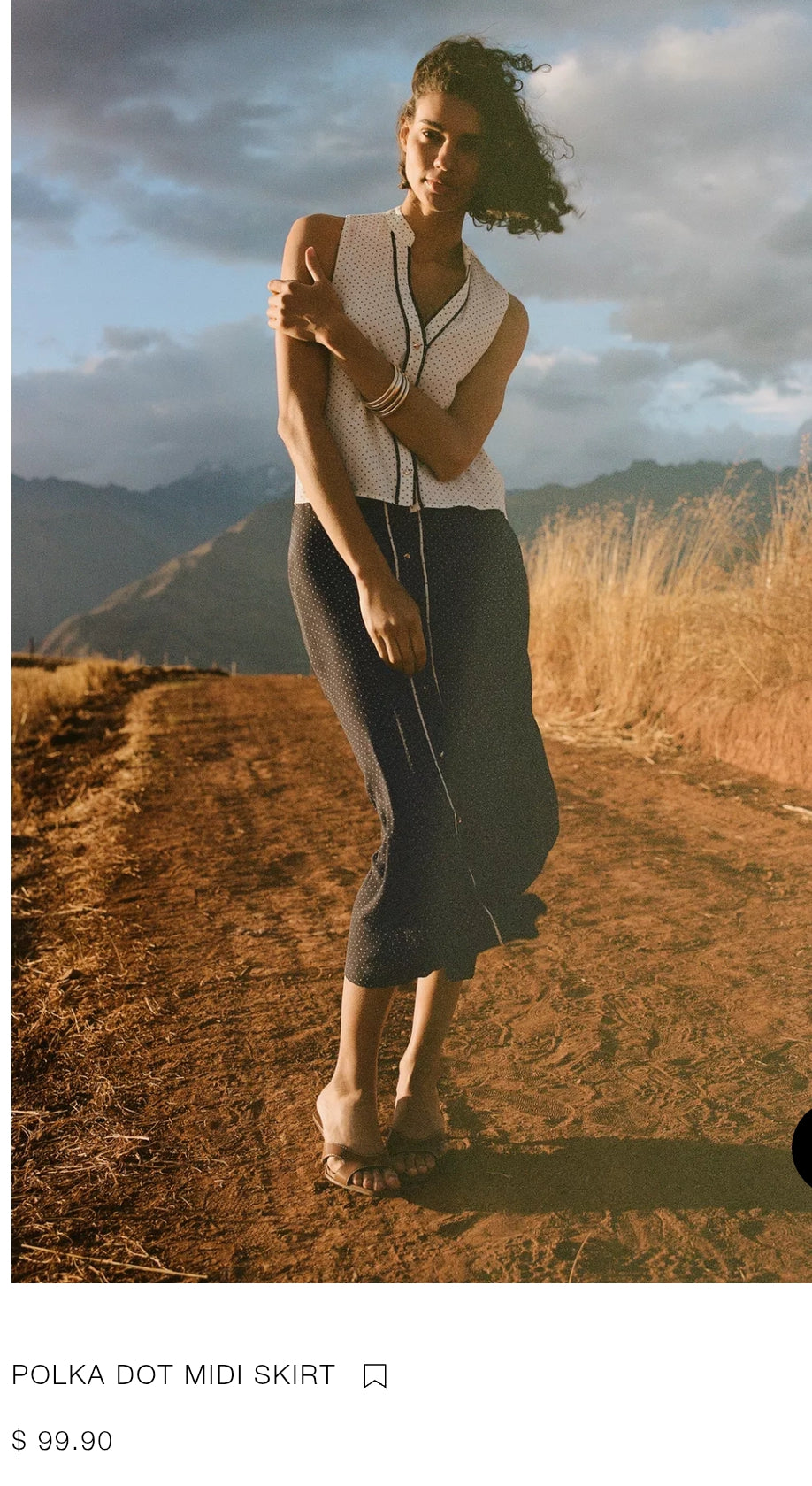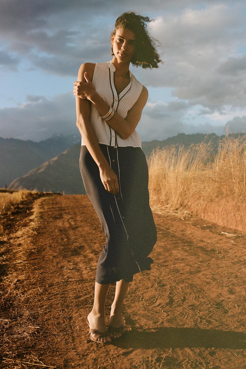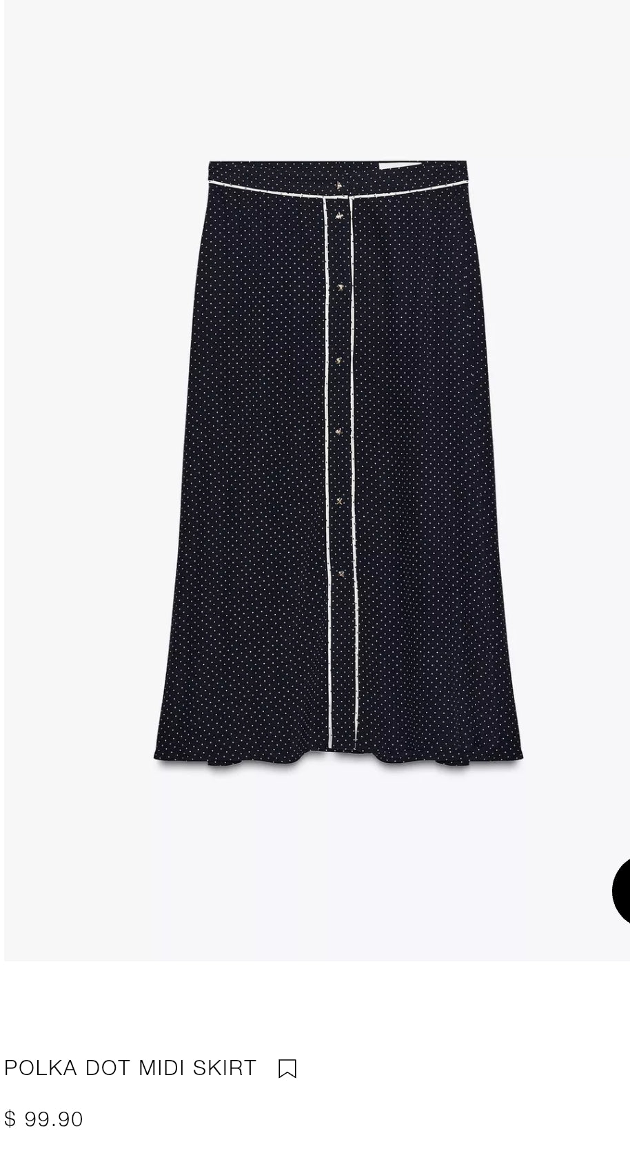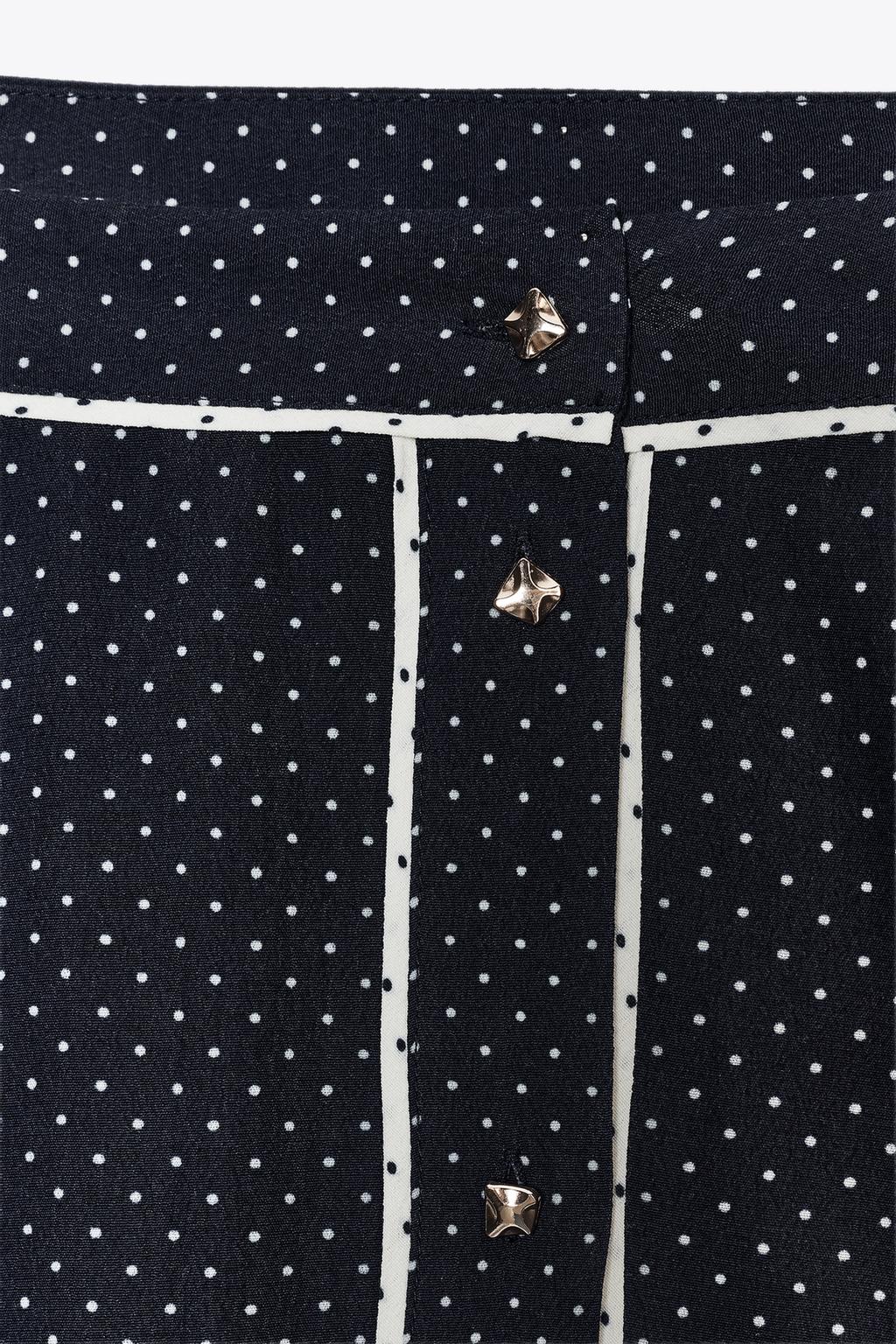 Jupe taille haute. Poches latérales dissimulées dans les coutures. Passepoil contrasté. Fermeture boutonnée sur le devant.