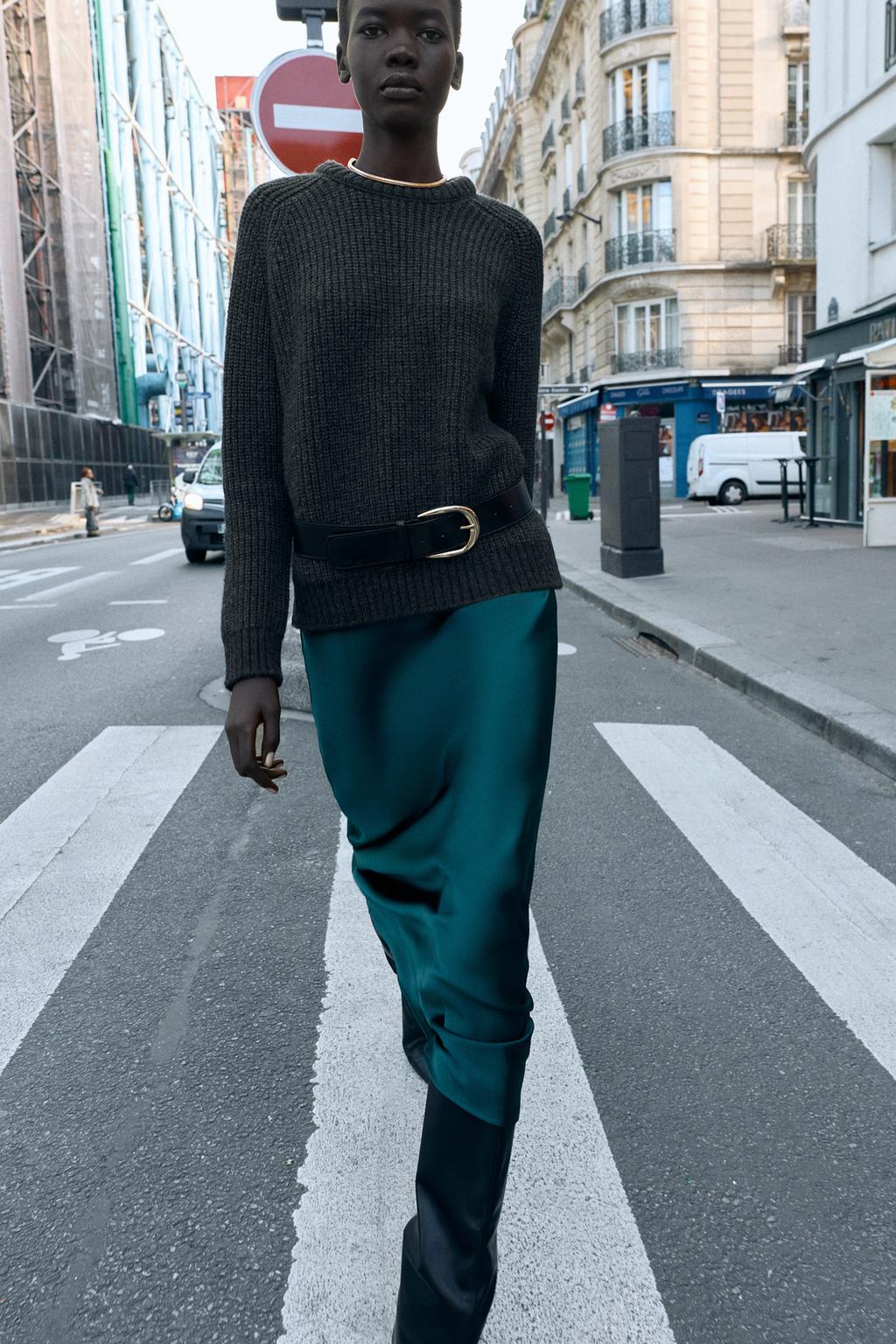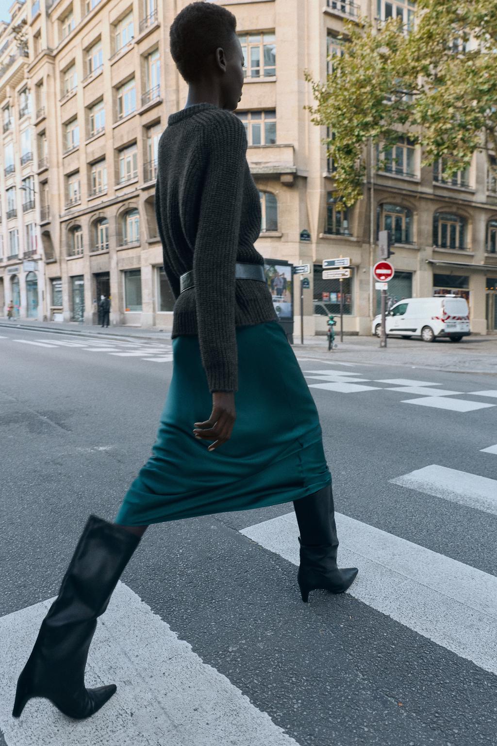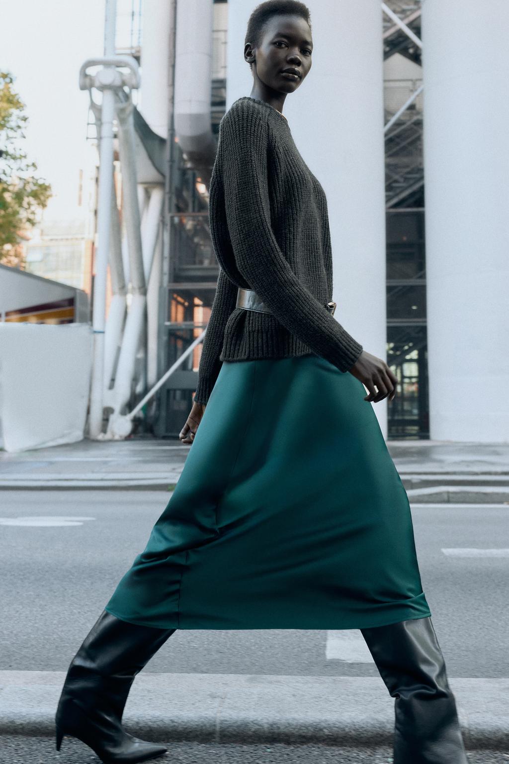 Jupe mi-longue avec taille élastique. Tissu satiné.