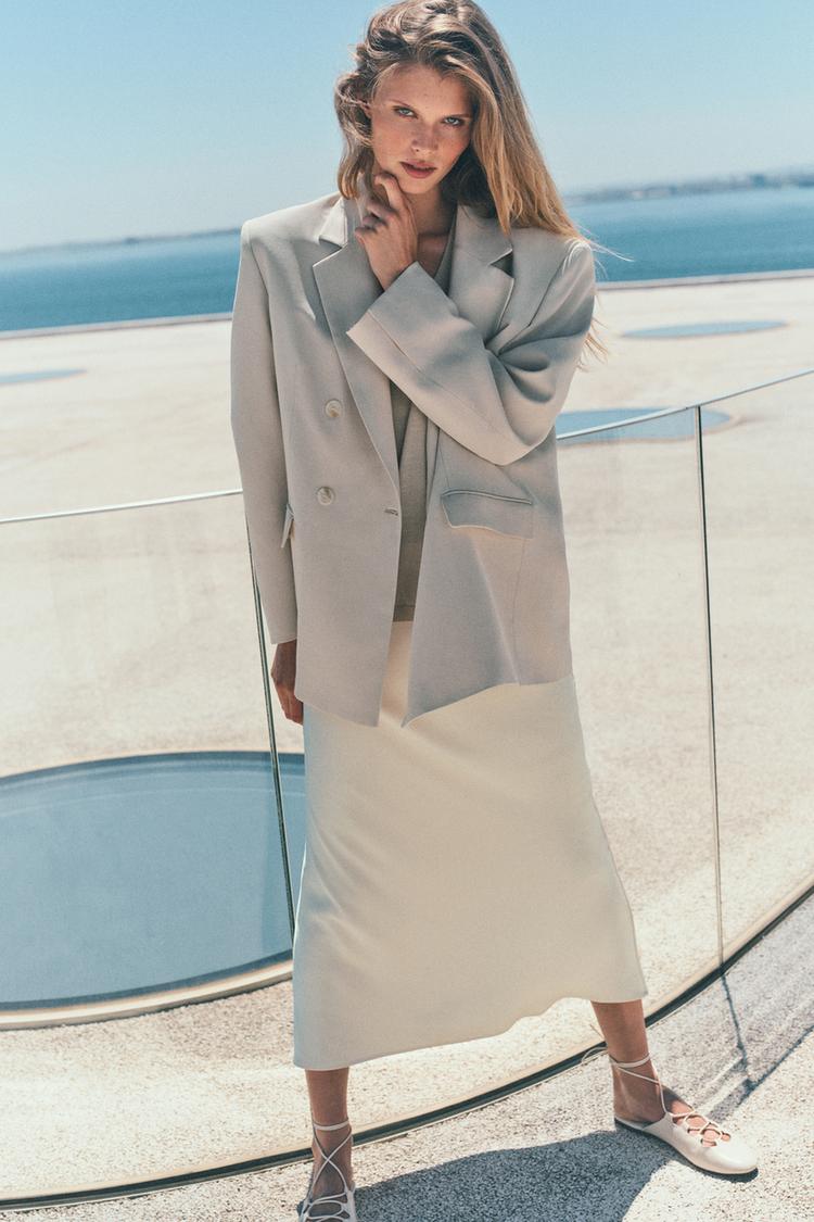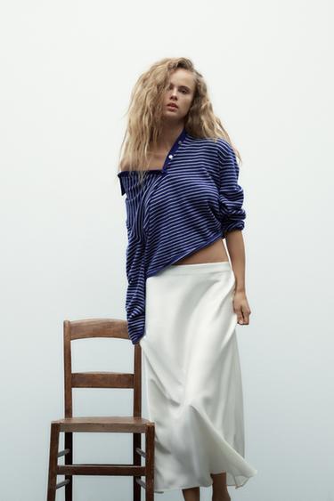 Jupe mi-longue confectionnée à partir d’un tissu satiné.Taille mi-haute élastique.