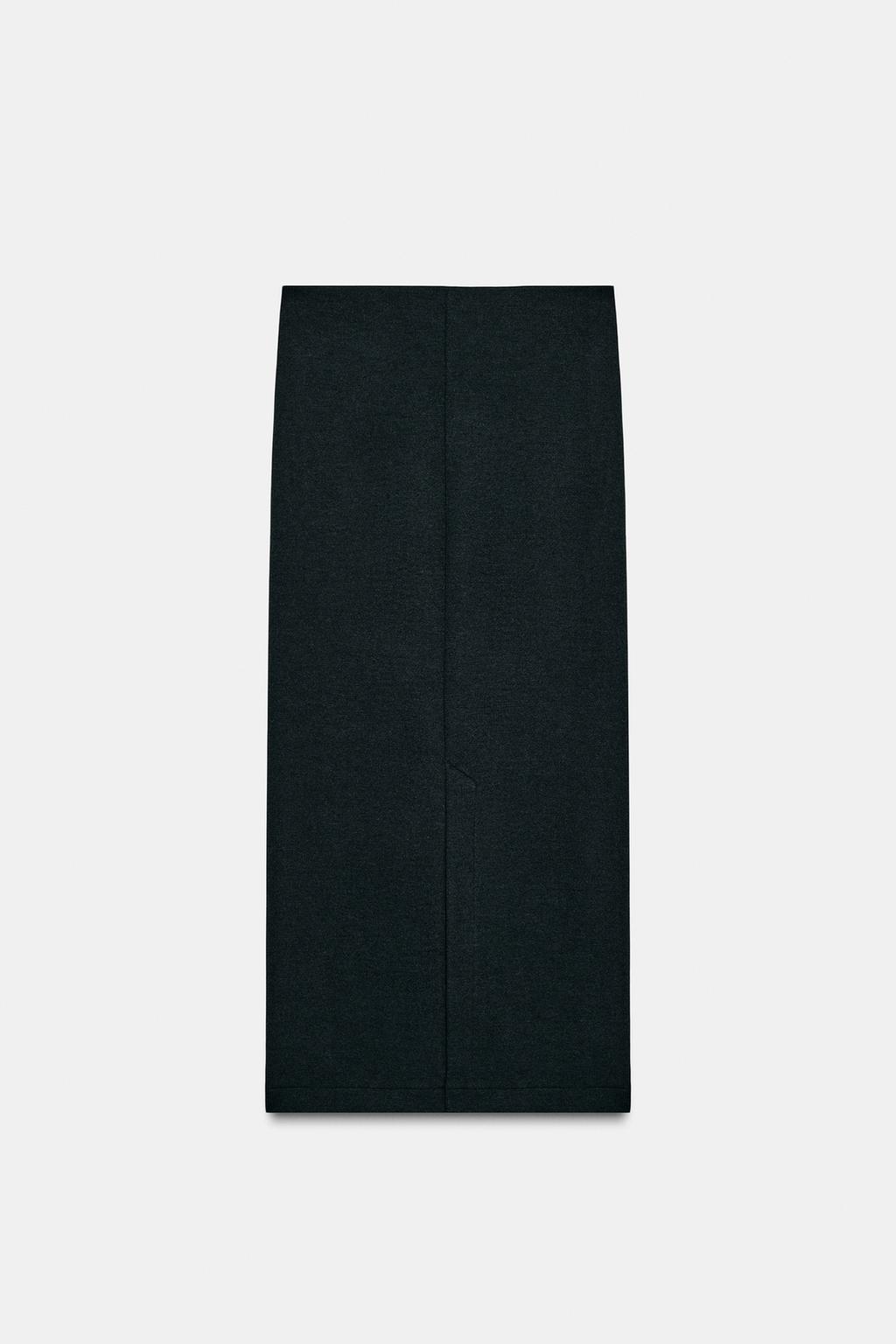 Jupe mi-longue confectionnée en tissu doux. Taille mi-haute et taille avec élastique. Bas droit avec ouverture dans le dos.