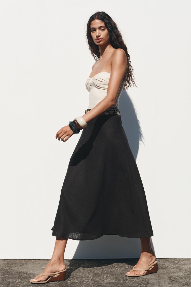 Jupe confectionnée avec du lin. Taille haute avec ceinture. Bas évasé. Fermeture latérale avec zip dissimulé dans la couture.