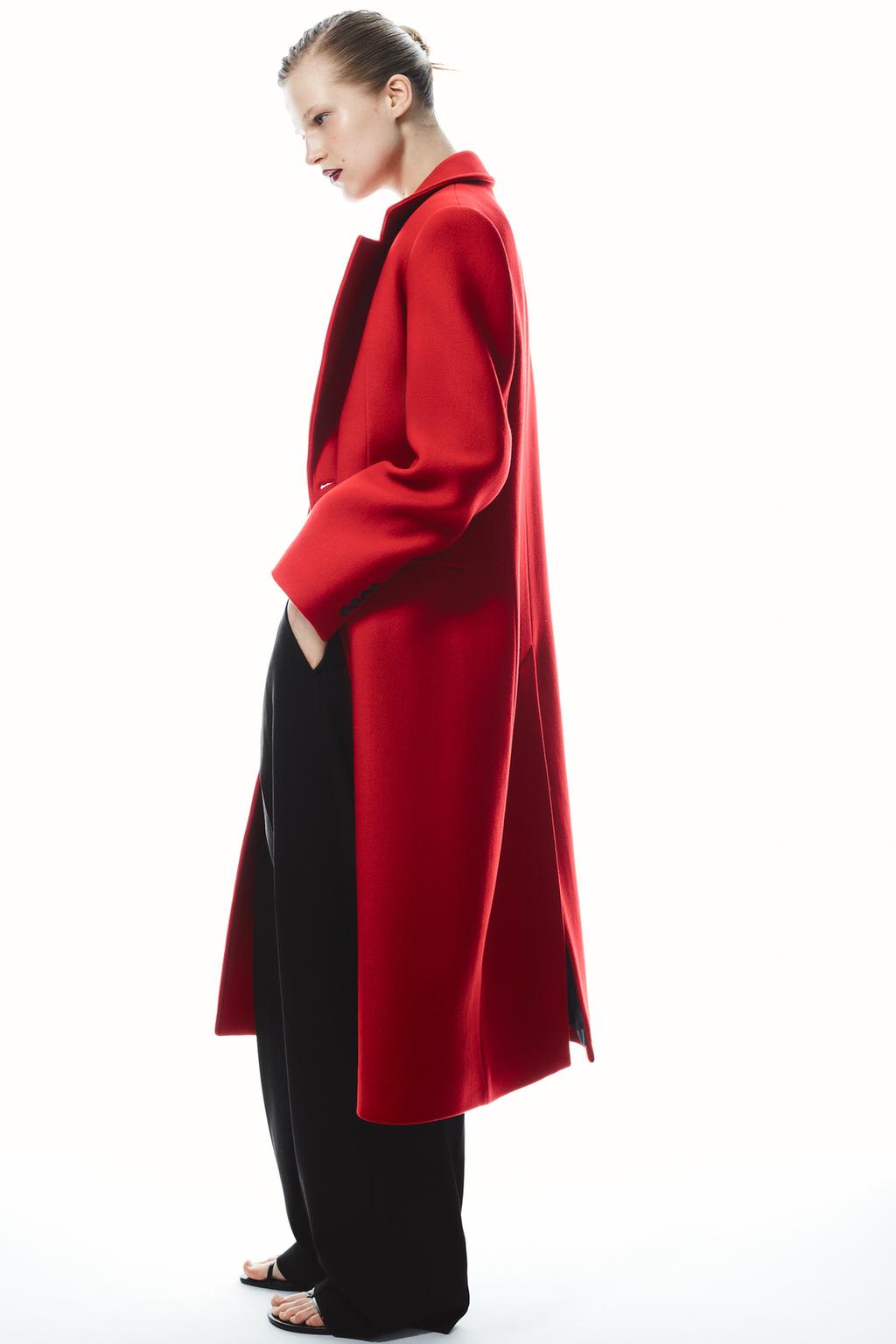 Coat made of wool blend yarn. Featuring a lapel collar and long sleeves. Front flap pockets. Double-breasted button fastening at the front.