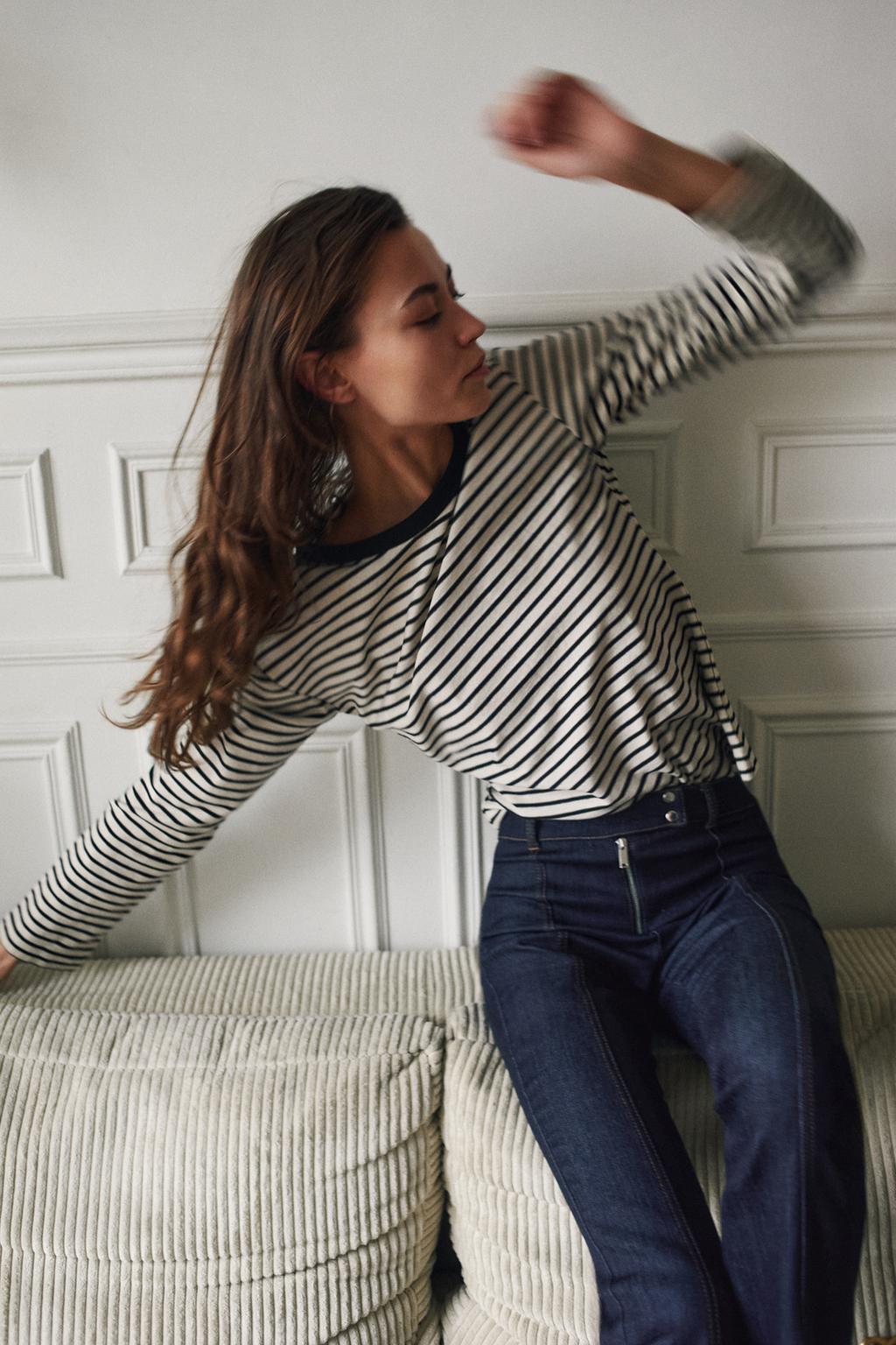 Jean taille normale. Jambe ajustée et bas avec ouverture devant. Fermeture à l'avant avec fermeture éclair, bouton intérieur et boutons-pression.