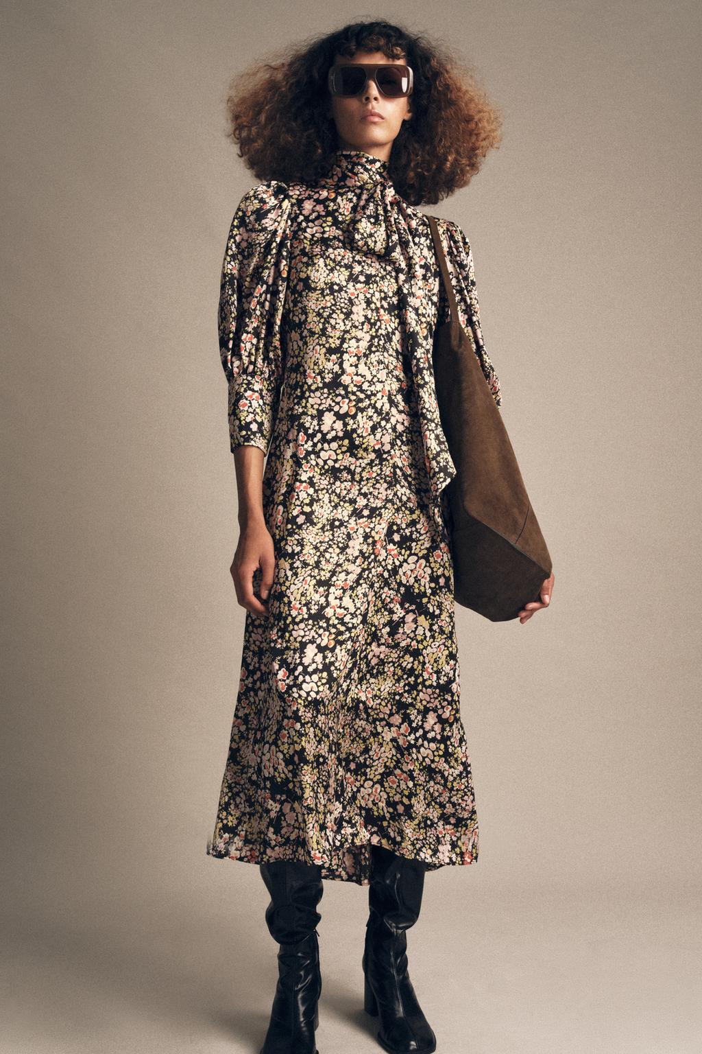 Robe midi à col rond et col en V ajustable avec des liens dans le même tissu. Manches longues bouffantes terminées par des poignets. Détail d'estampillage floral. Bas asymétrique.