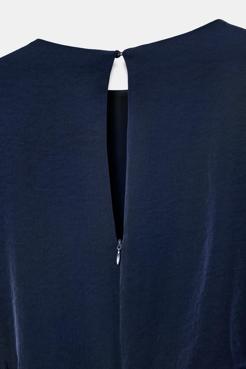 Robe à col rond et manches courtes. Détails de plis à la taille et pinces sur le devant. Poches avant. Bas avec ouverture dans le dos. Fermeture arrière avec zip invisible, ouverture et bouton.