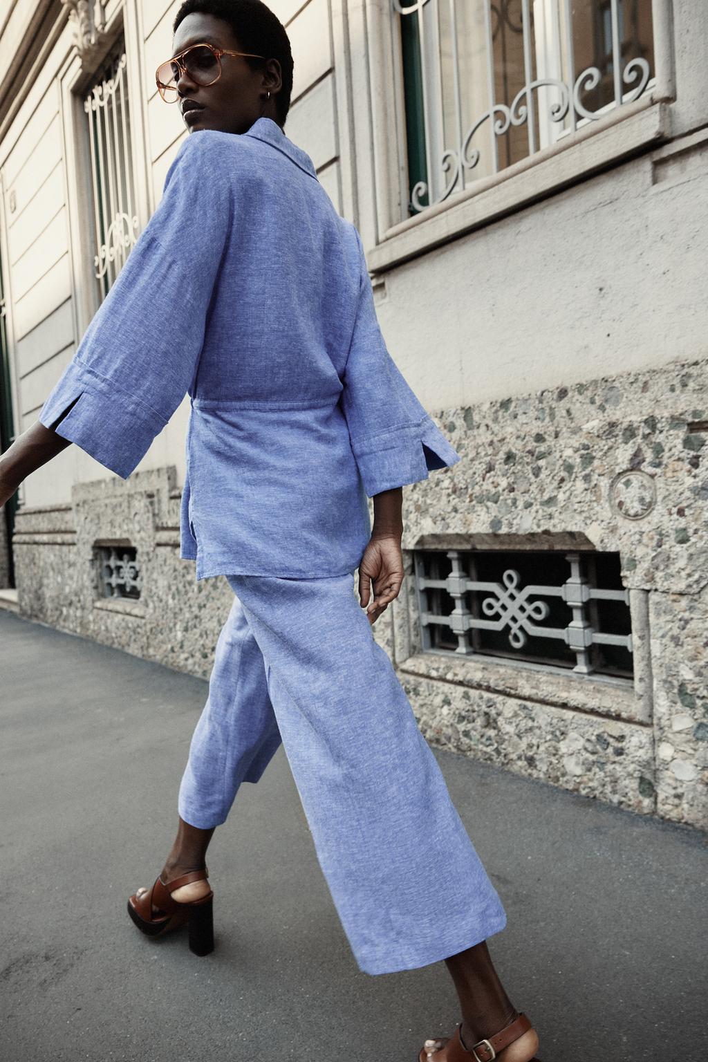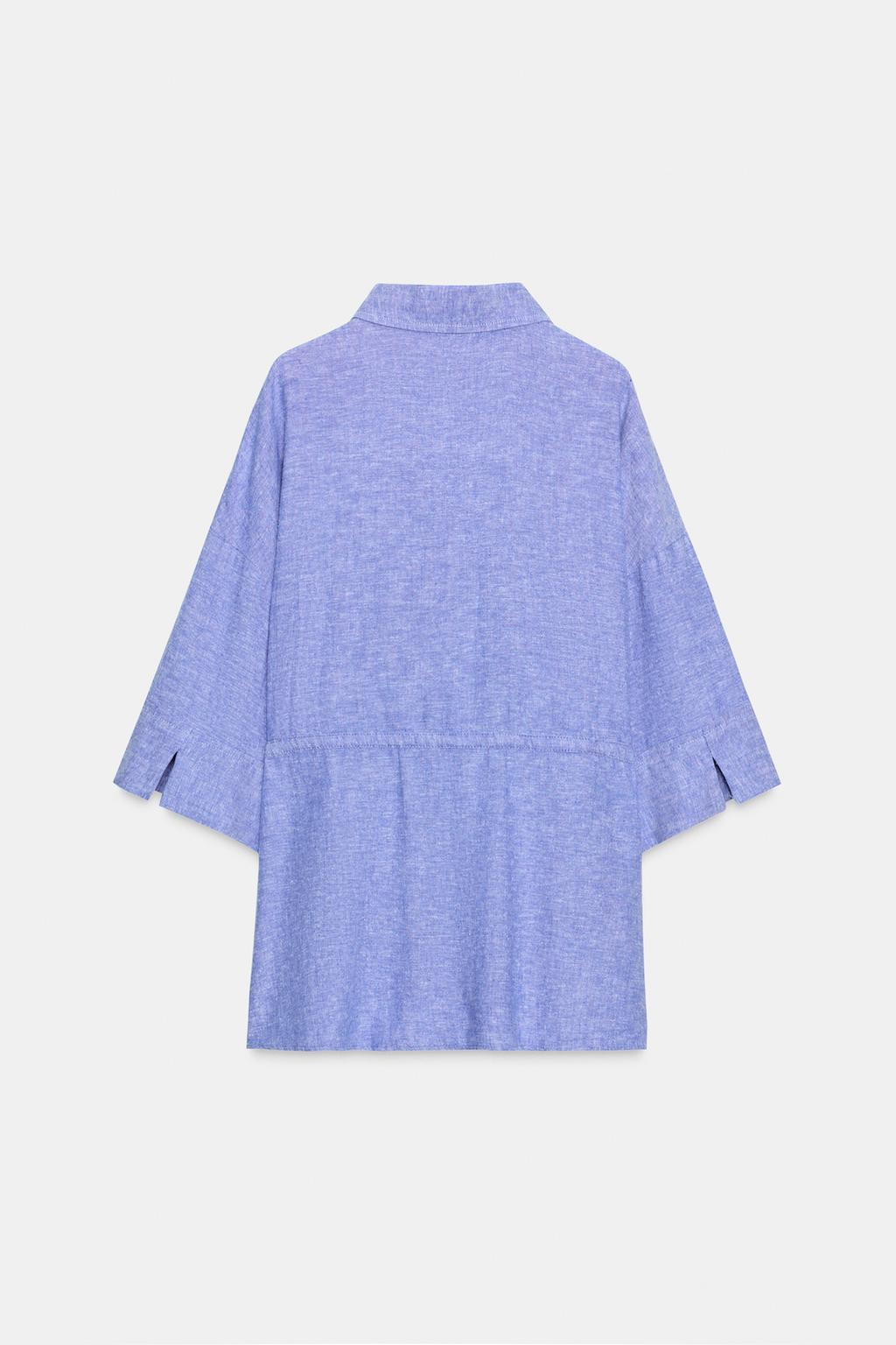 Shirt made of a linen blend. Featuring a lapel collar and a v-neckline. Sleeves below the elbow. Adjustable drawstring waist. Hem with side vents. Front button fastening.
