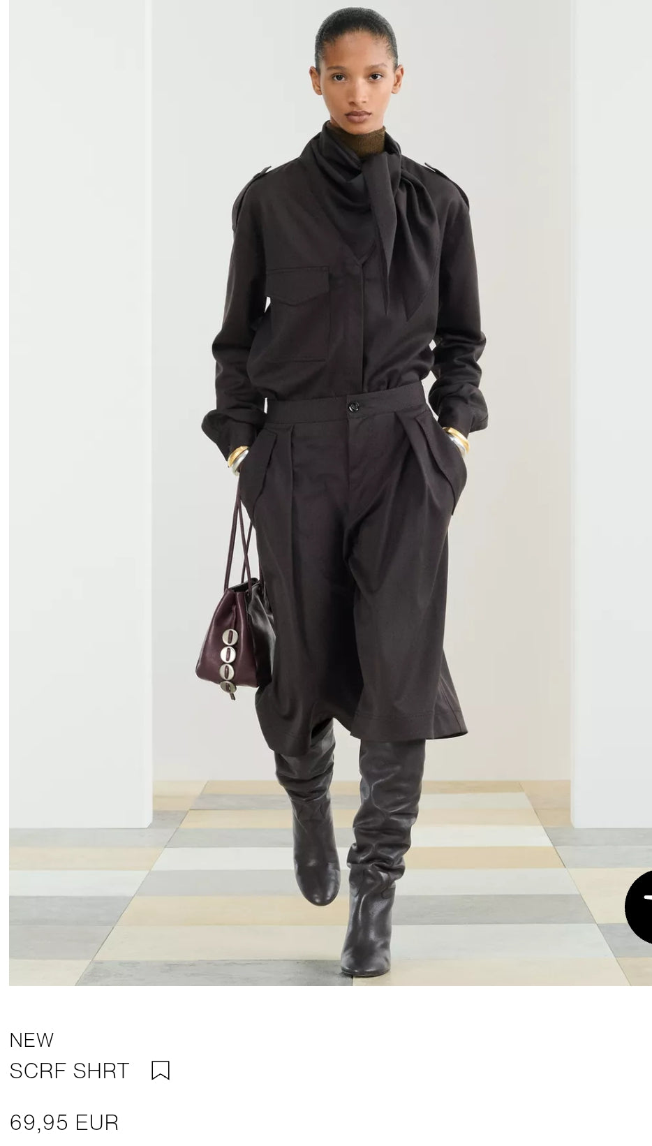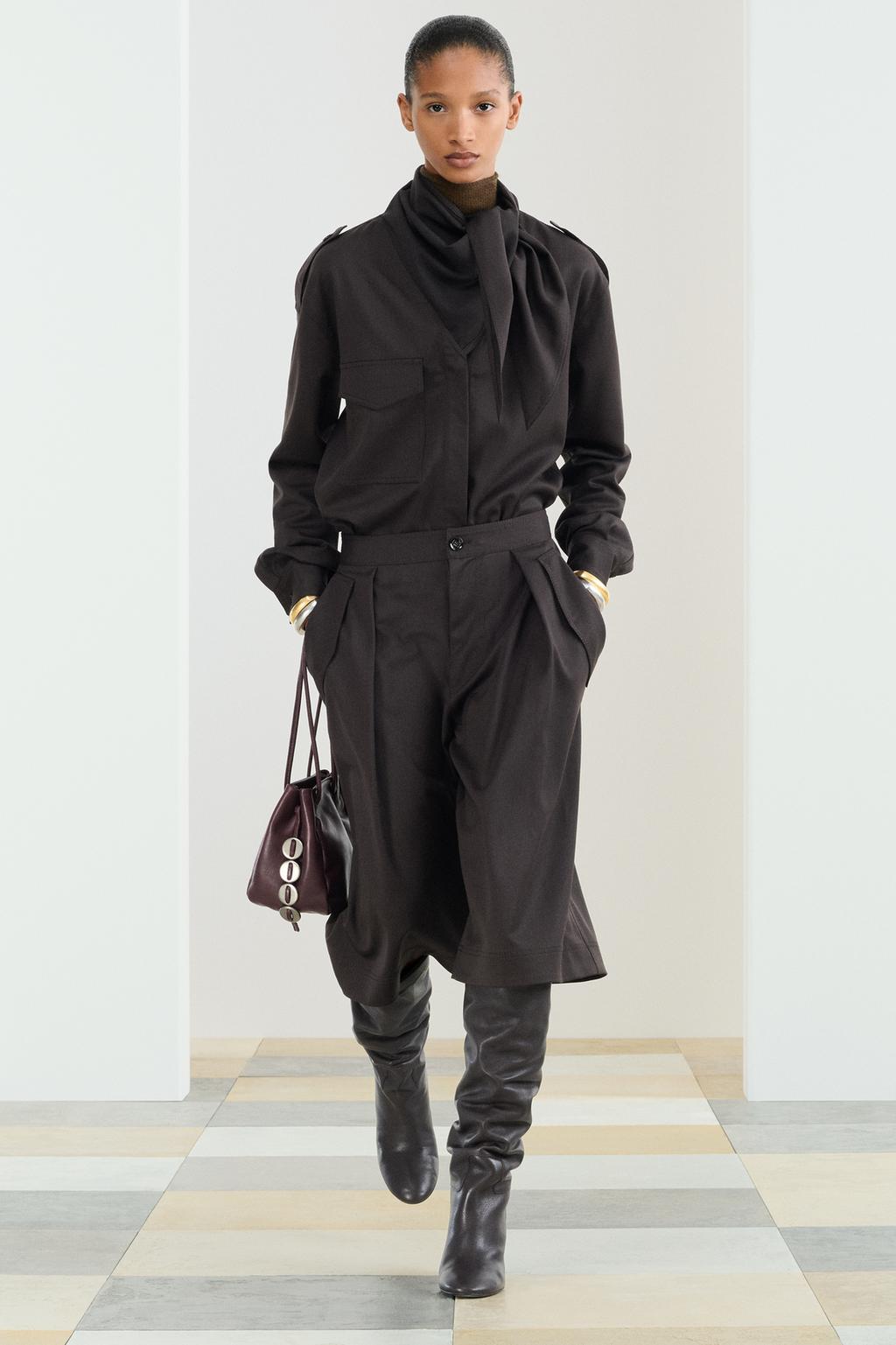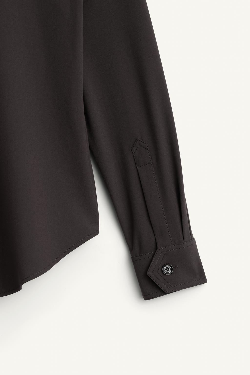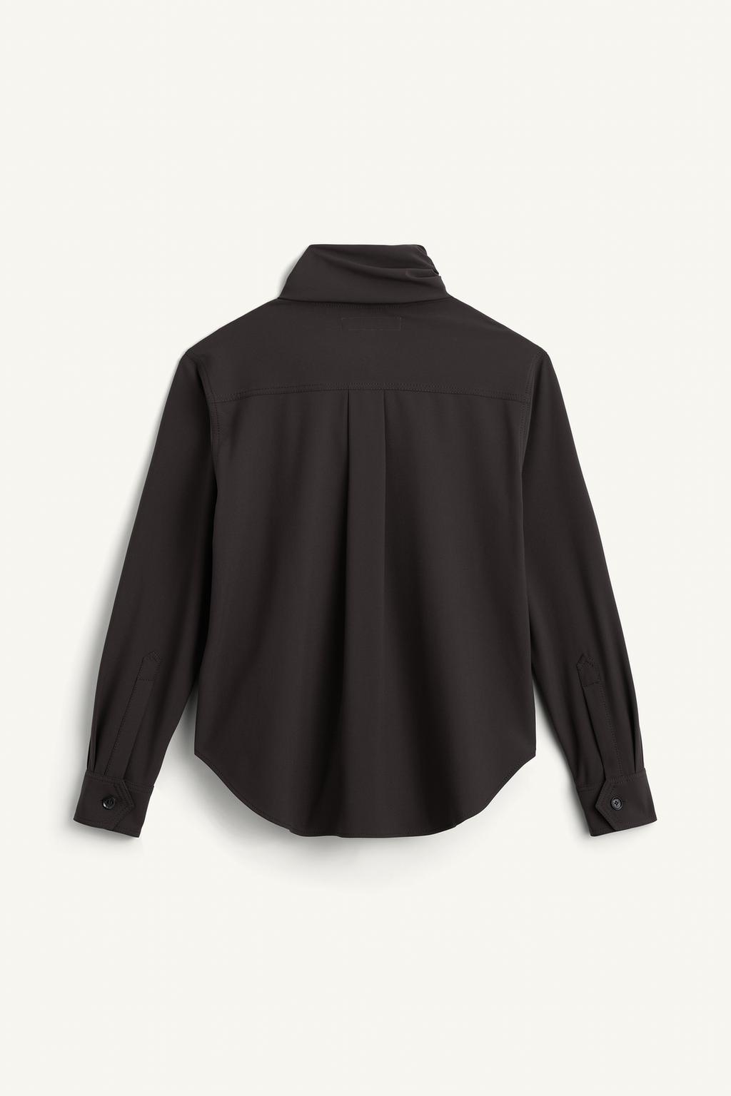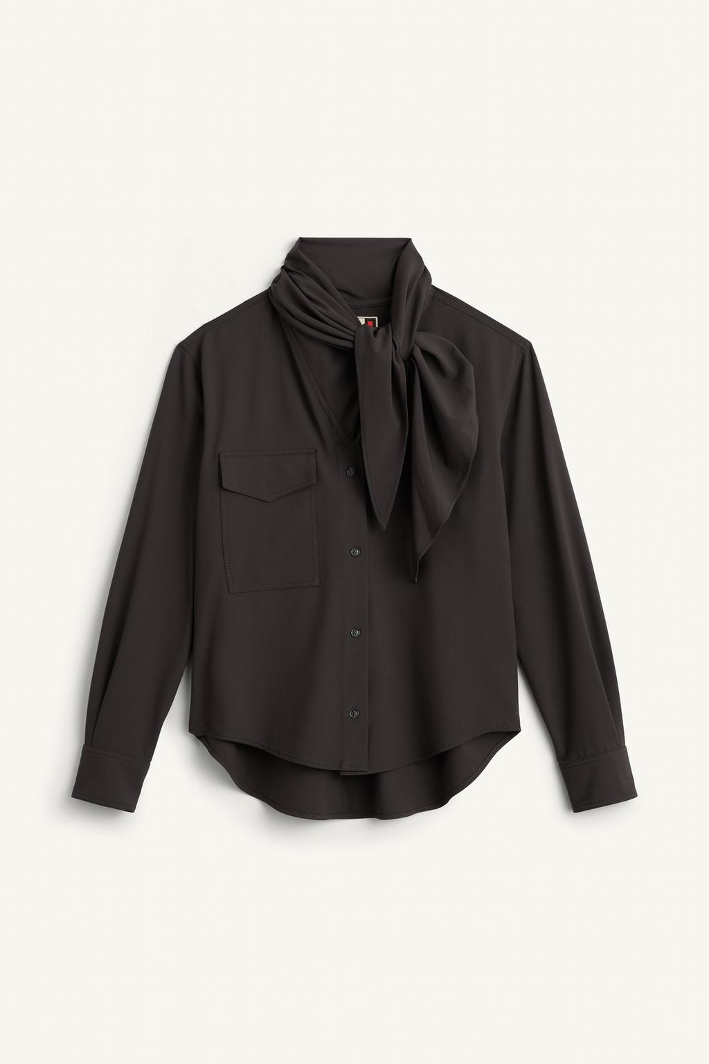 Chemise confectionnée en filature avec 29% de viscose. Col montant avec foulard en même tissu. Manches longues à poignets. Poches poitrine plaquées à rabat. Ourlet asymétrique arrondi. Fermeture boutonnée sur le devant.
