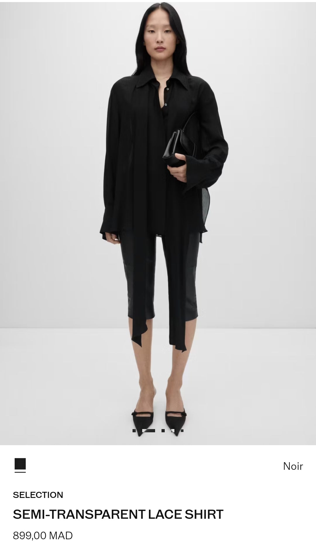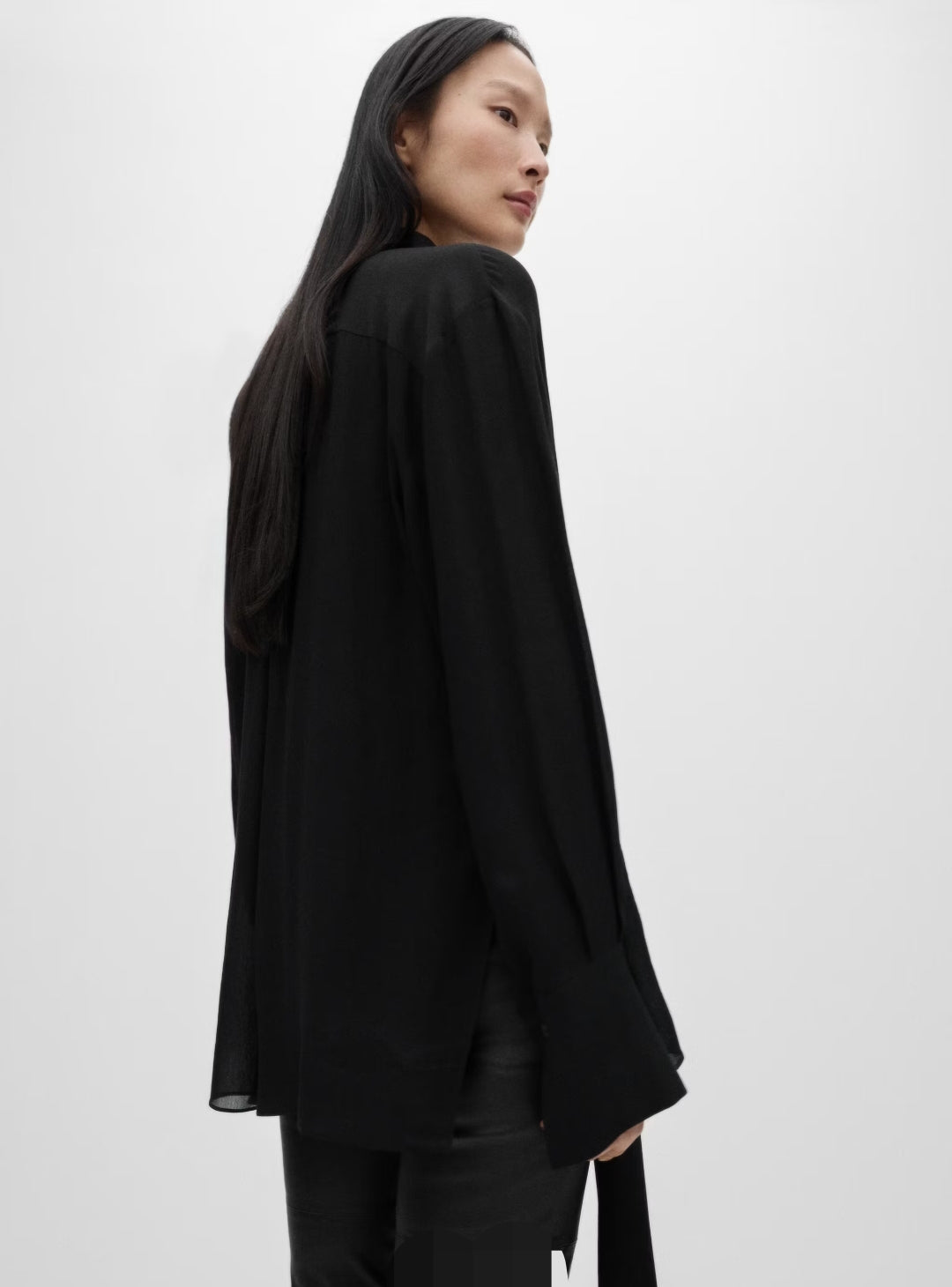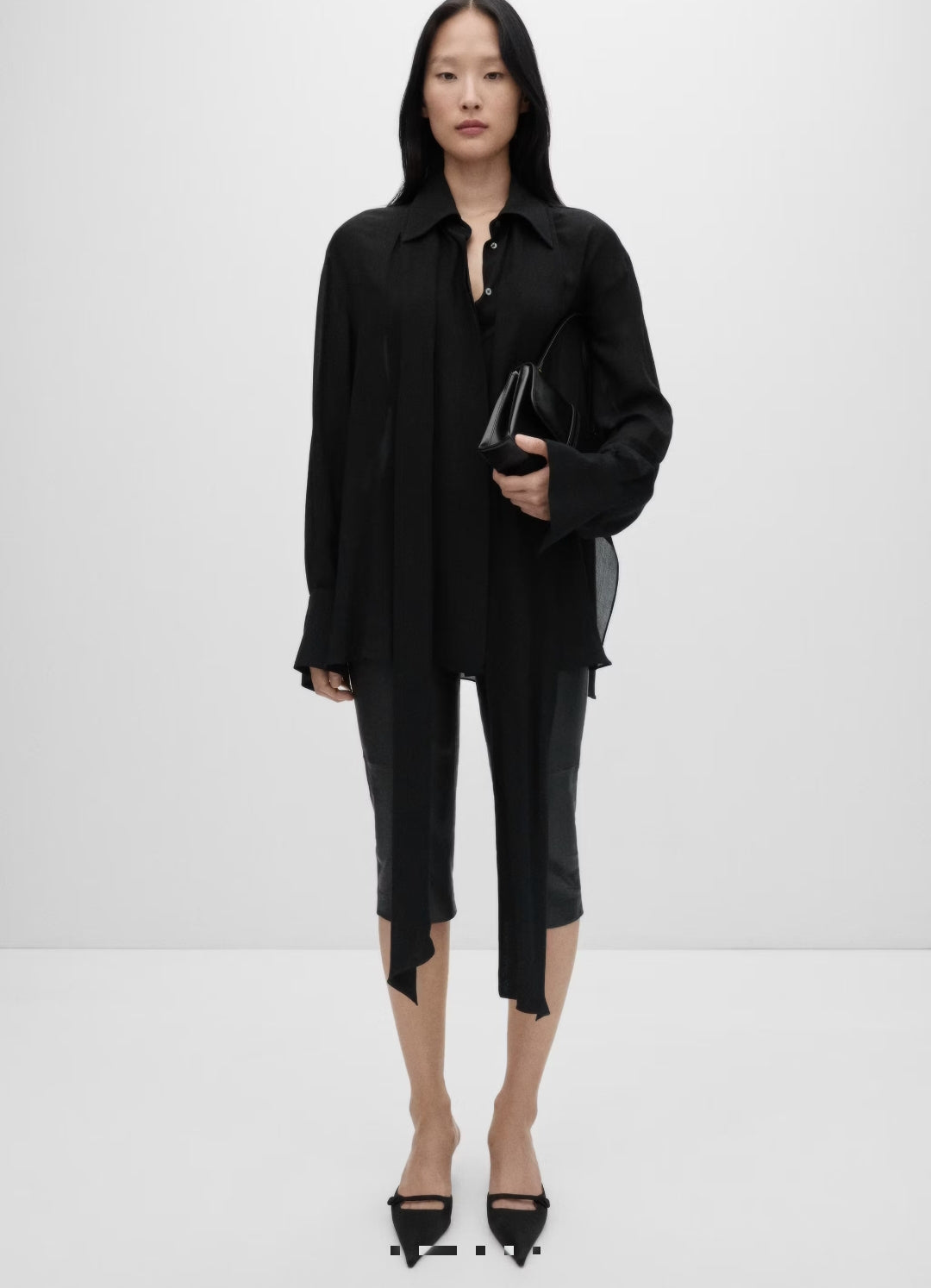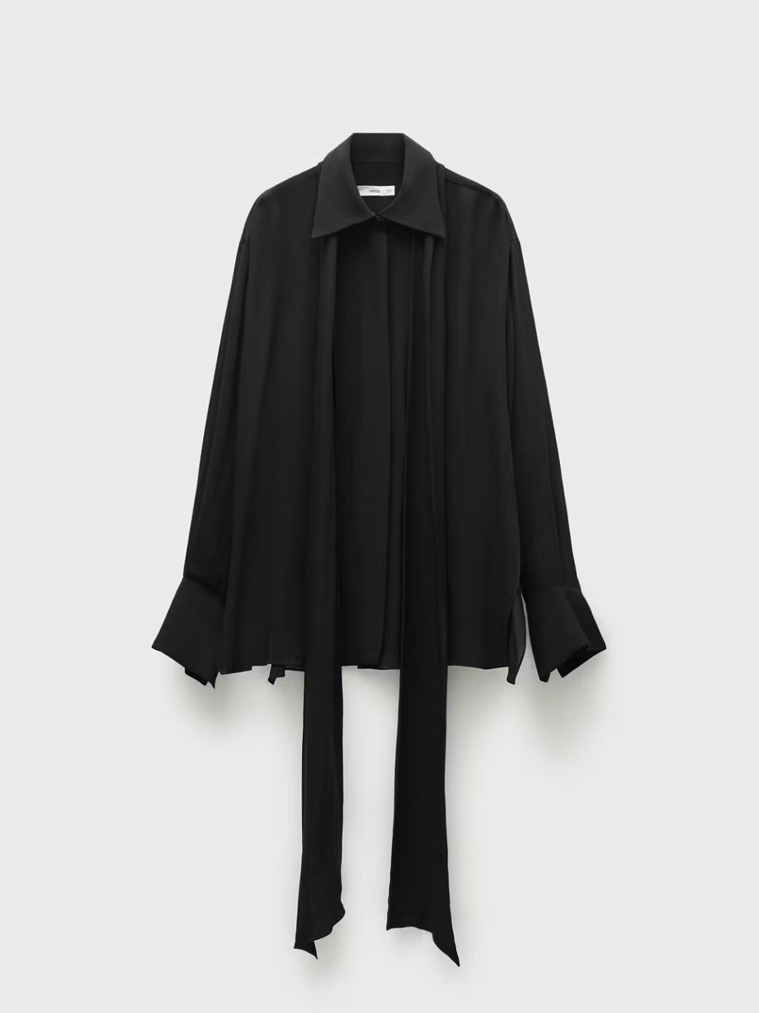 Coupe droite. Col chemise. Nœud au col. Bas fendu sur les côtés. Collection Selection. Tissu semi-transparent. Tissu fluide. Manches longues et poignets boutonnés. Fermeture avant avec boutons.
