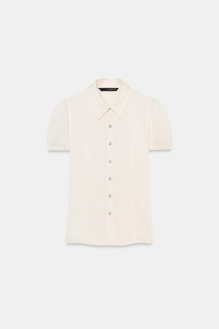Collared shirt with puff short sleeves. Featuring side vents at the hem and a front snap-button fastening.