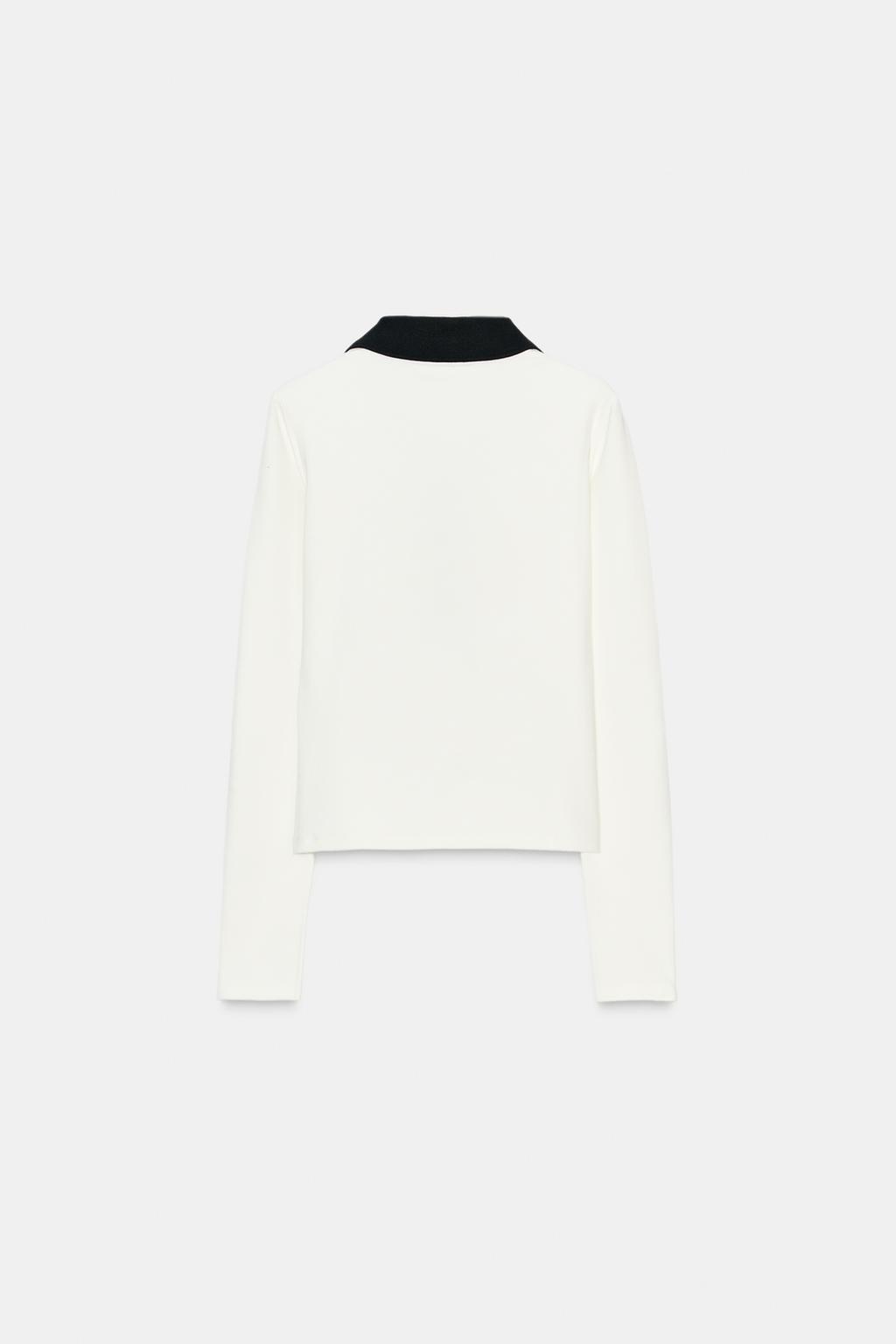 Top type polo confectionné en tissu maille élastique et souple avec une trame compacte, douce et opaque. Col à revers et col en v à manches longues. Ourlet droit. Fermeture boutonnée sur le devant avec des boutons métalliques.
