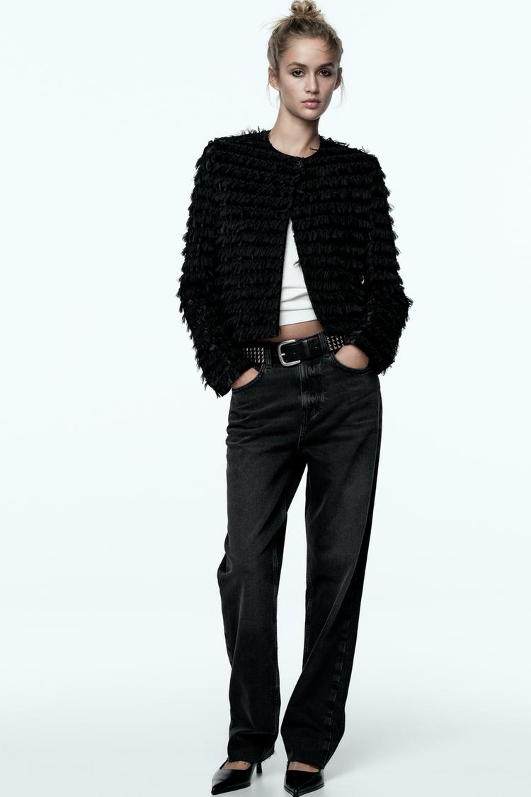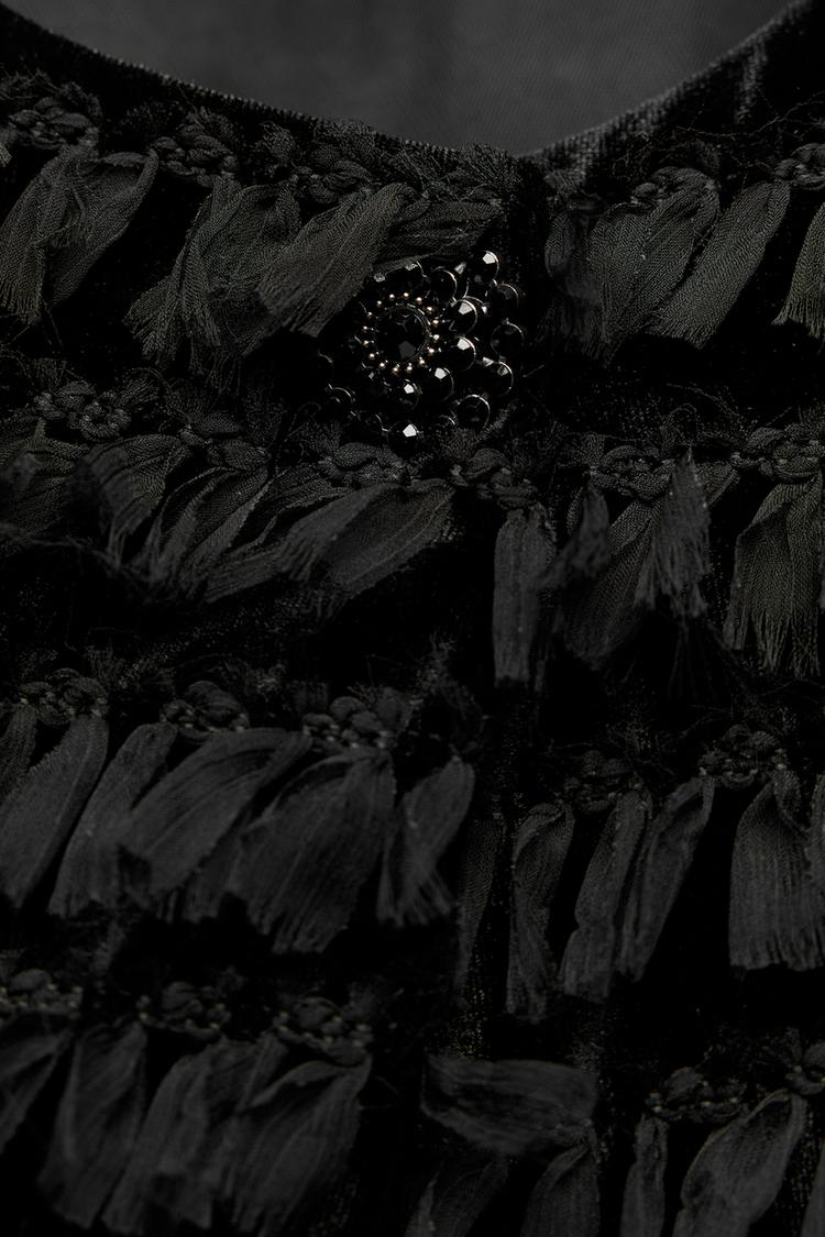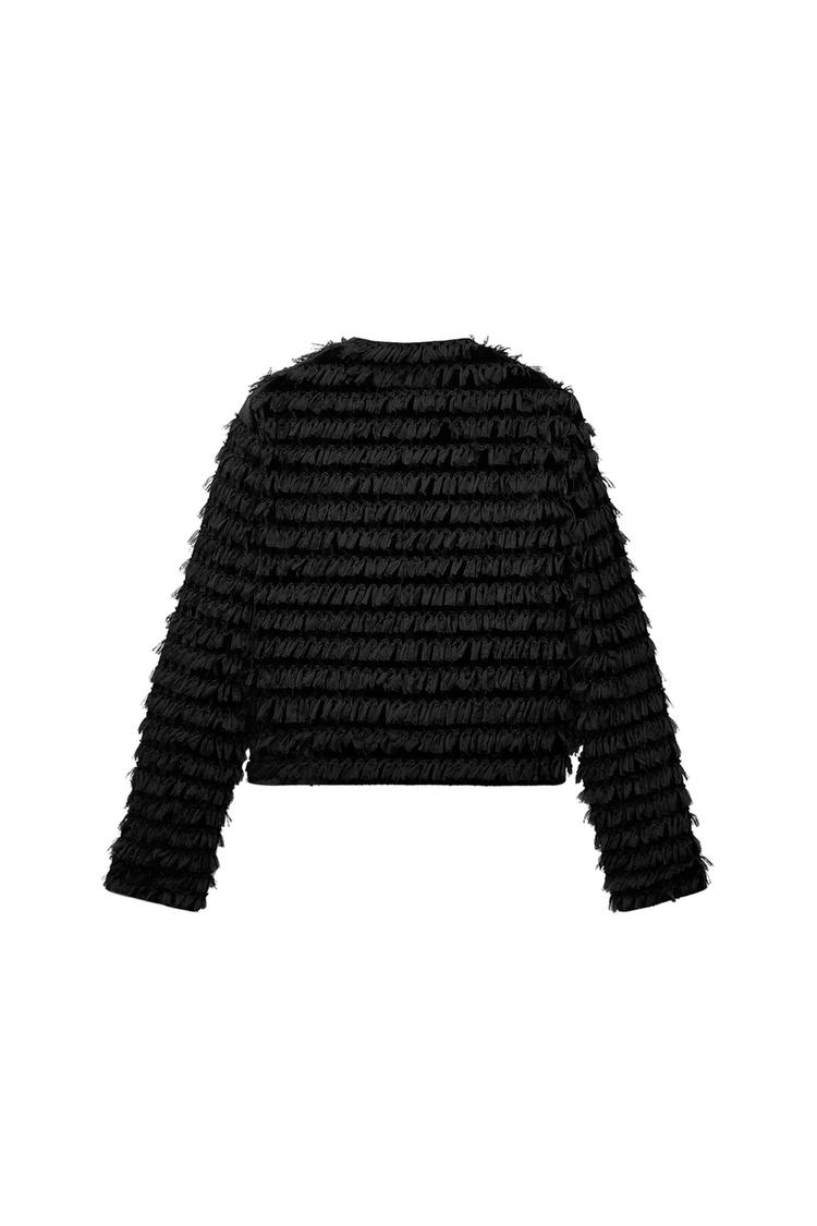Veste en velours à col rond et manches longues. Application de franges contrastantes. Fermeture devant par bouton bijou.