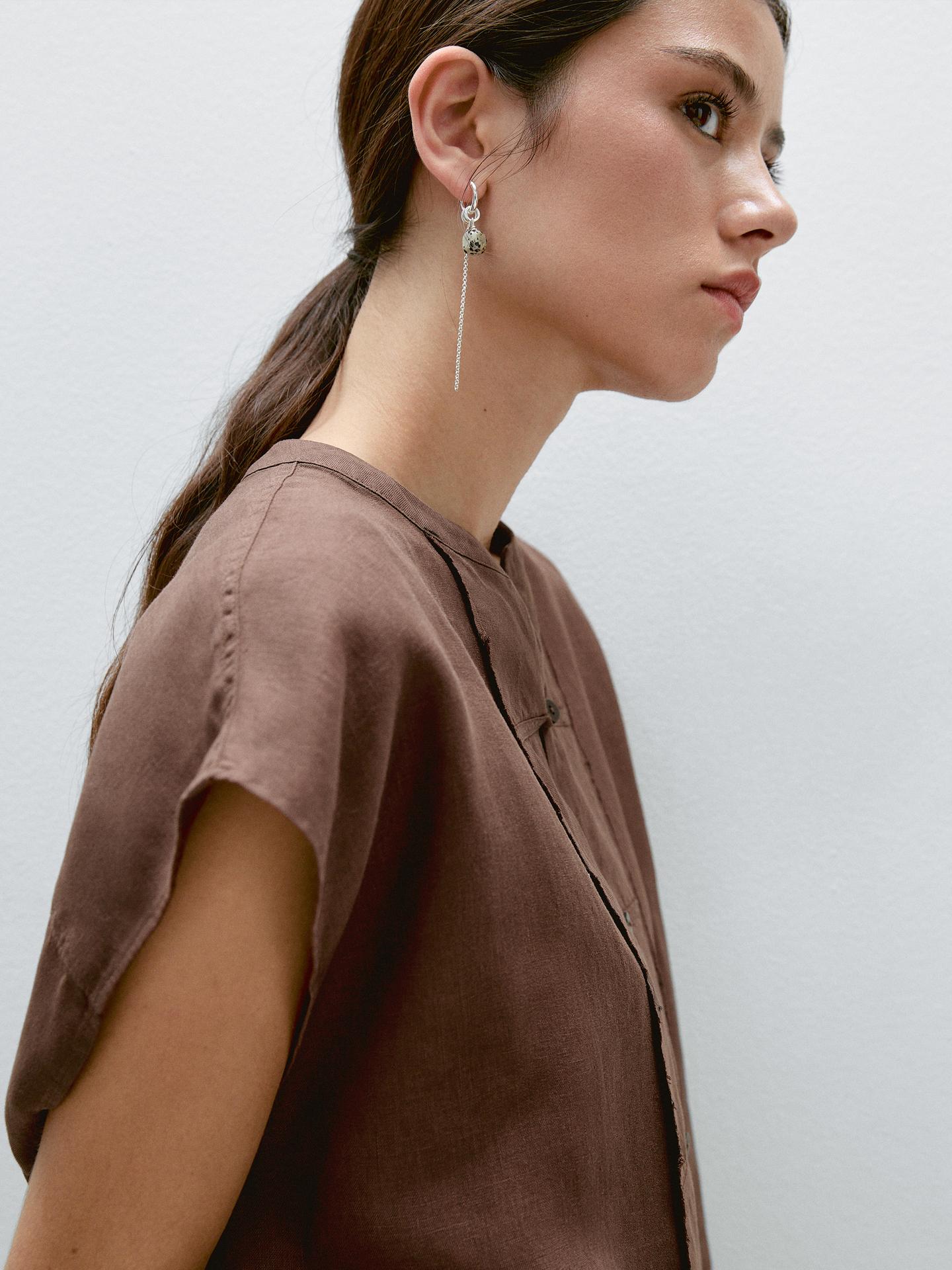 Veste sans manches 100 % lin . Col mao. Sans manches. Fermeture à pression avec boutons et cordons .